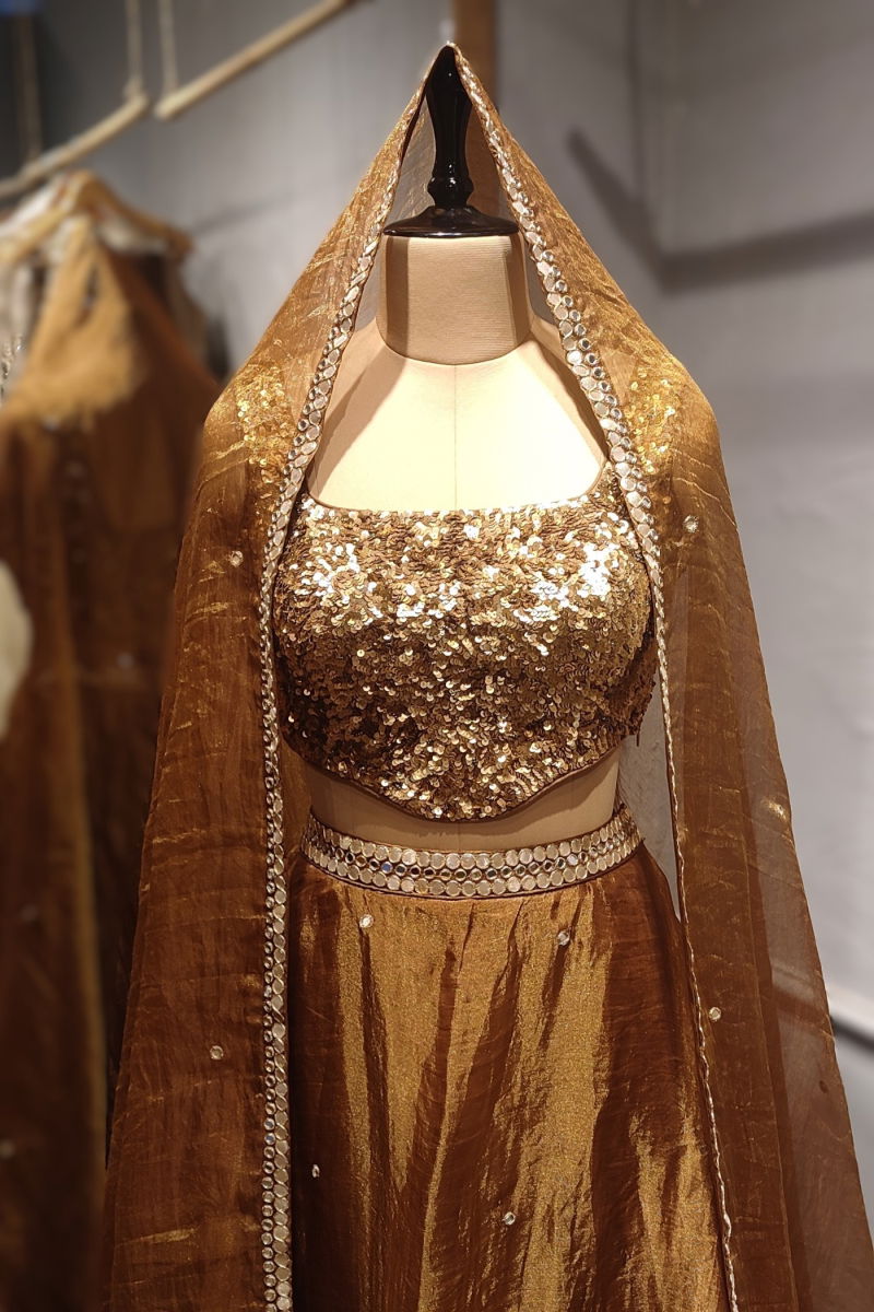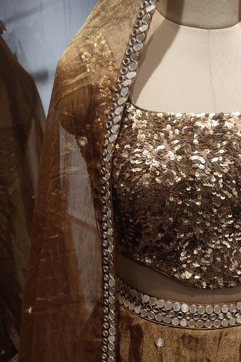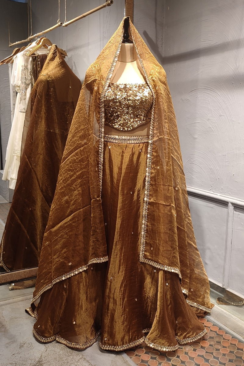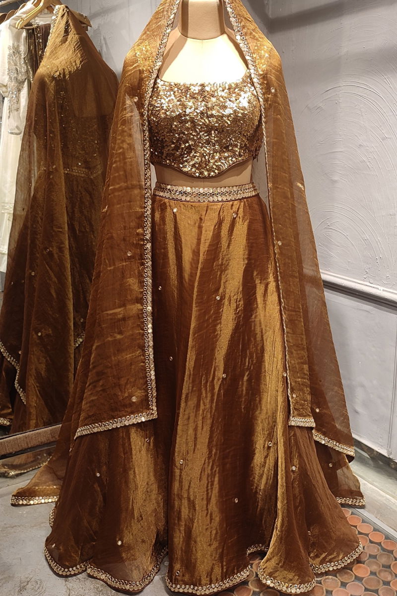 The rich brown hue of the lehenga adds a sense of warmth and sophistication, elevating the overall appeal of the ensemble. Whether worn for a traditional celebration or a grand occasion, this garment effortlessly exudes elegance and grace, making a bold statement of style and refinement.