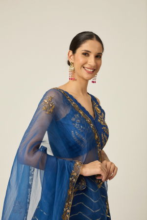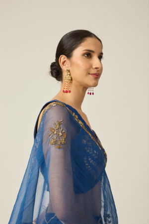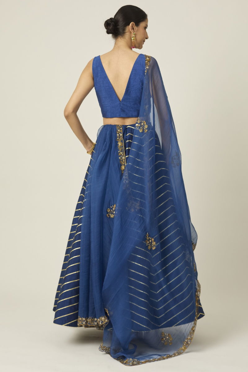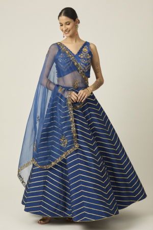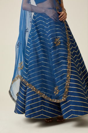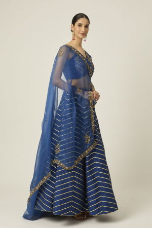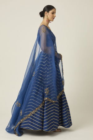 The Ink Blue color raw silk lehanga exudes sheer elegance with its exquisite gota work. Each intricate detail adorning the fabric tells a story of craftsmanship and artistry. The deep hue of Ink Blue lends a sense of sophistication, while the raw silk fabric adds a touch of ethereal grace, draping gracefully with every movement. Whether it's delicate gota work, making it a statement piece for any occasion. With its timeless charm and intricate craftsmanship, this lehenga will captivate attention and leave a lasting impression.