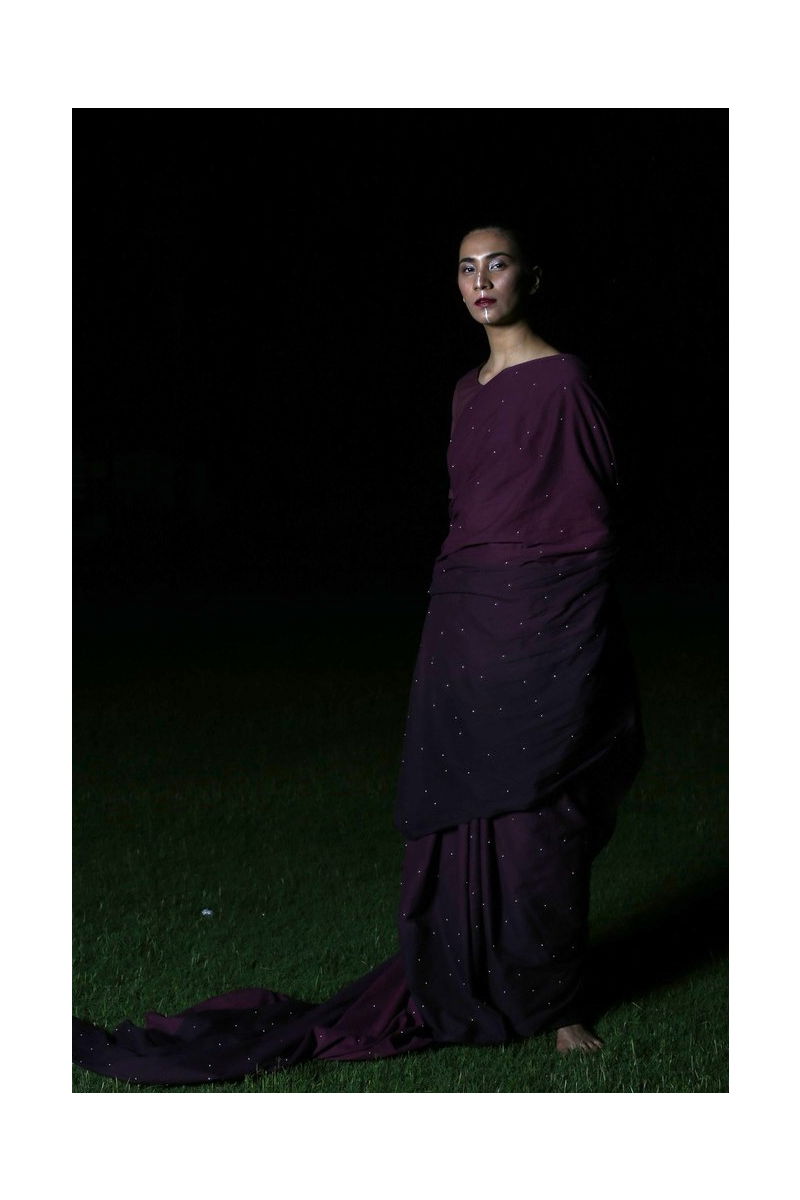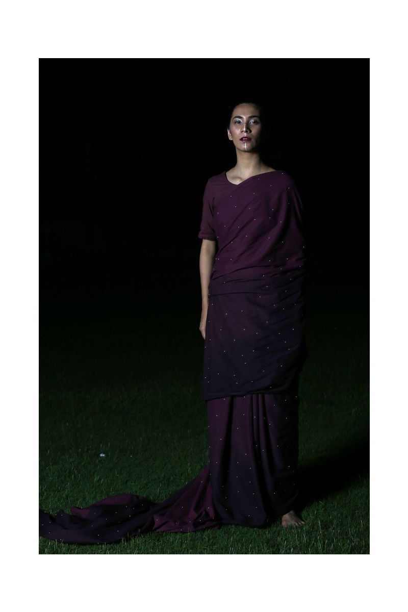The Ashwin Tara Plum Saree, crafted in fine mulmul with micro-sized moon white beads, embodies a delicate balance of tradition and modern elegance. Dyed using organic techniques, the saree features a rich plum red hue that radiates warmth and sophistication. Its lightweight, breathable fabric ensures comfort throughout the day, making it ideal for extended wear during festive gatherings, weddings, haldi, mehandi ceremonies, cocktail events, brunches, or even relaxed lounging. The intricate beadwork and finely detailed motifs enhance the saree’s visual appeal, adding a touch of refined craftsmanship to every drape. Designed as part of the TARA collection by Peeli Dori, this saree is a versatile addition to any wardrobe, suitable for both formal and casual occasions. With its timeless design and premium material, the Ashwin Tara Plum Saree is a perfect choice for brides-to-be, partygoers, and fashion enthusiasts seeking a piece that blends artistry with comfort.