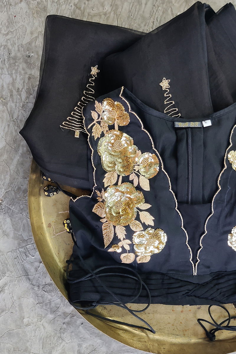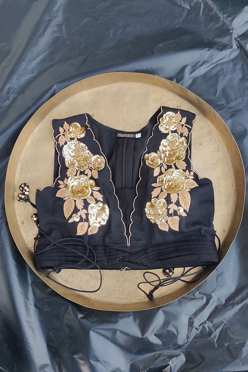 This blouse is in a midnight black shade with highlights of gold done in hand embroidery lifting the look of the blouse. It is perfectly tailored as per measurements. Opening with a back zip, it also has adjustable strings on the sides which add to the beauty as well as comfort. Pair this blouse with your traditional silks or breezy organzas and chiffons.
