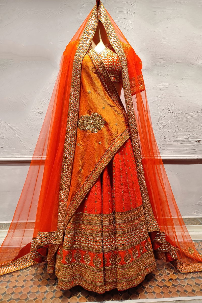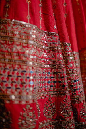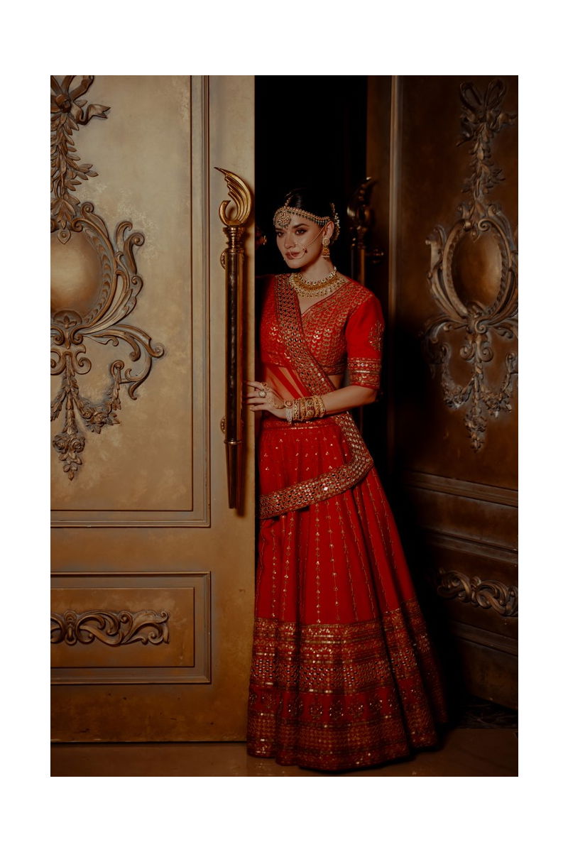 Contents | Featured in red colour dupion silk this wedding lehenga is embroidered heavily in zardozi embroidery. The blouse is also in dupion silk with very dense zardozi embroidery. Both dupattas are in net and tissue with four-sided borders and butties inside. |