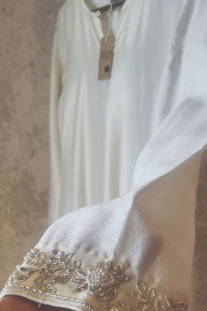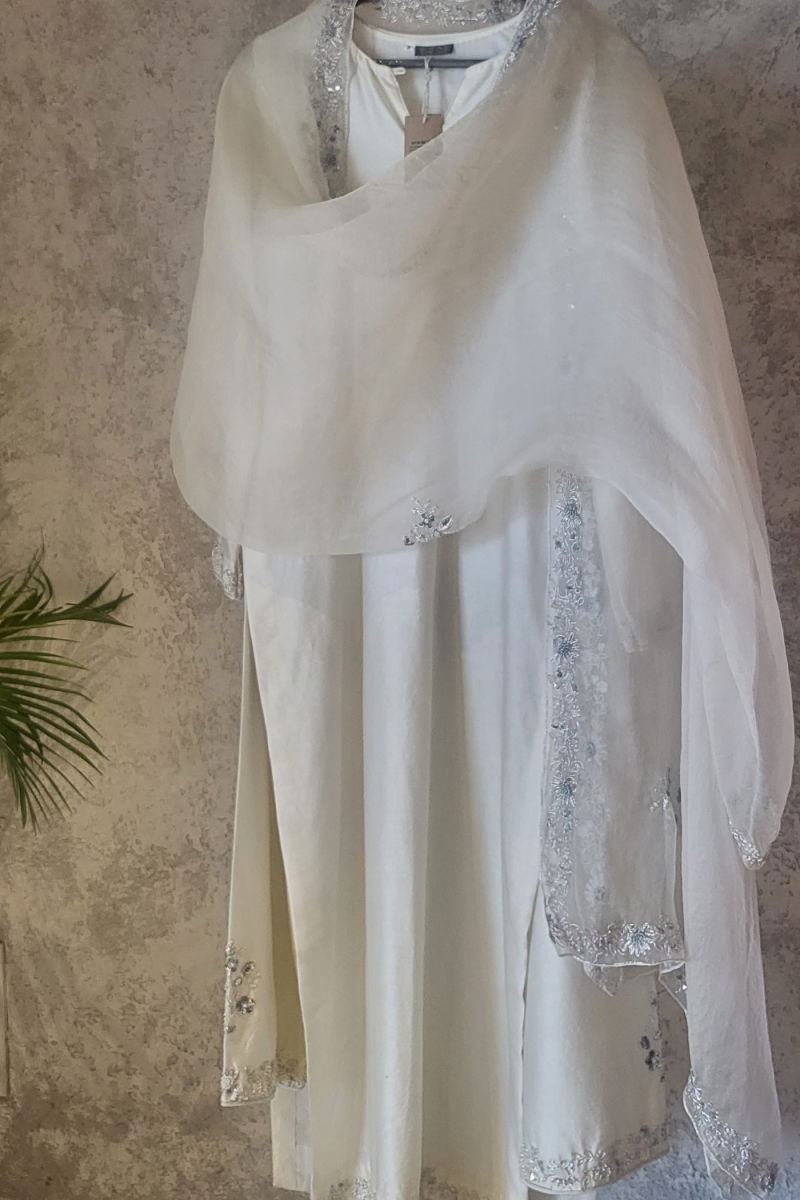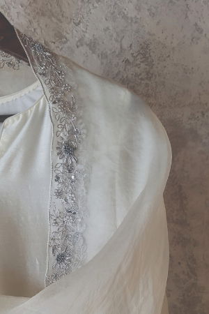 The IVORY CELINE CHANDERI SILK KURTA SET from the Lotus collection embodies timeless elegance, crafted for the modern woman who values sophistication and comfort. Made from premium Silk Chanderi, the kurta offers a breathable fit, ensuring ease of movement while maintaining a graceful silhouette. The intricate Zardosi hand embroidery adds a touch of opulence, meticulously applied to enhance the fabric's natural sheen. Complementing the kurta is a matching Silk Organza dupatta, delicately embellished with the same artisanal craftsmanship, creating a harmonious ensemble. Dyed using organic methods, the ivory hue radiates purity and subtle luminosity, making it ideal for a wide range of occasions including weddings, mehandi ceremonies, sangeet events, receptions, cocktail gatherings, and festive celebrations. Designed for versatility, this kurta set blends traditional artistry with contemporary wearability, making it a cherished addition to any wardrobe. Perfect for both special events and everyday elegance, it reflects the brand’s commitment to quality, sustainability, and refined design.