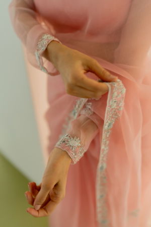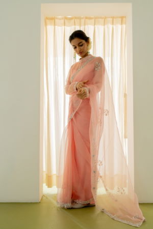 Contents | This Blush Pink hand embroidered organza saree is a stunning one-of-a kind piece . The intricate embroidery is done by skilled artisans that features delicate floral patterns that is truly breathtaking and add a touch of glamour and sophistication. |