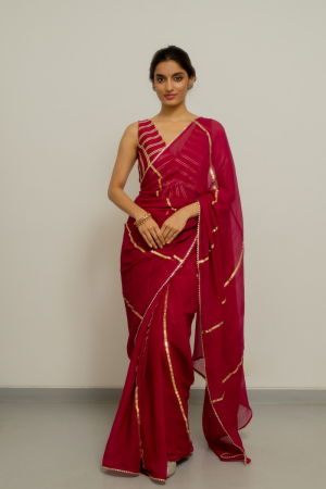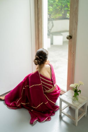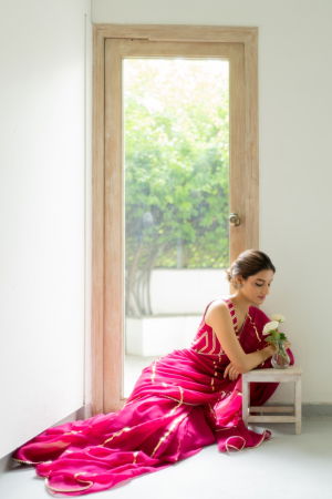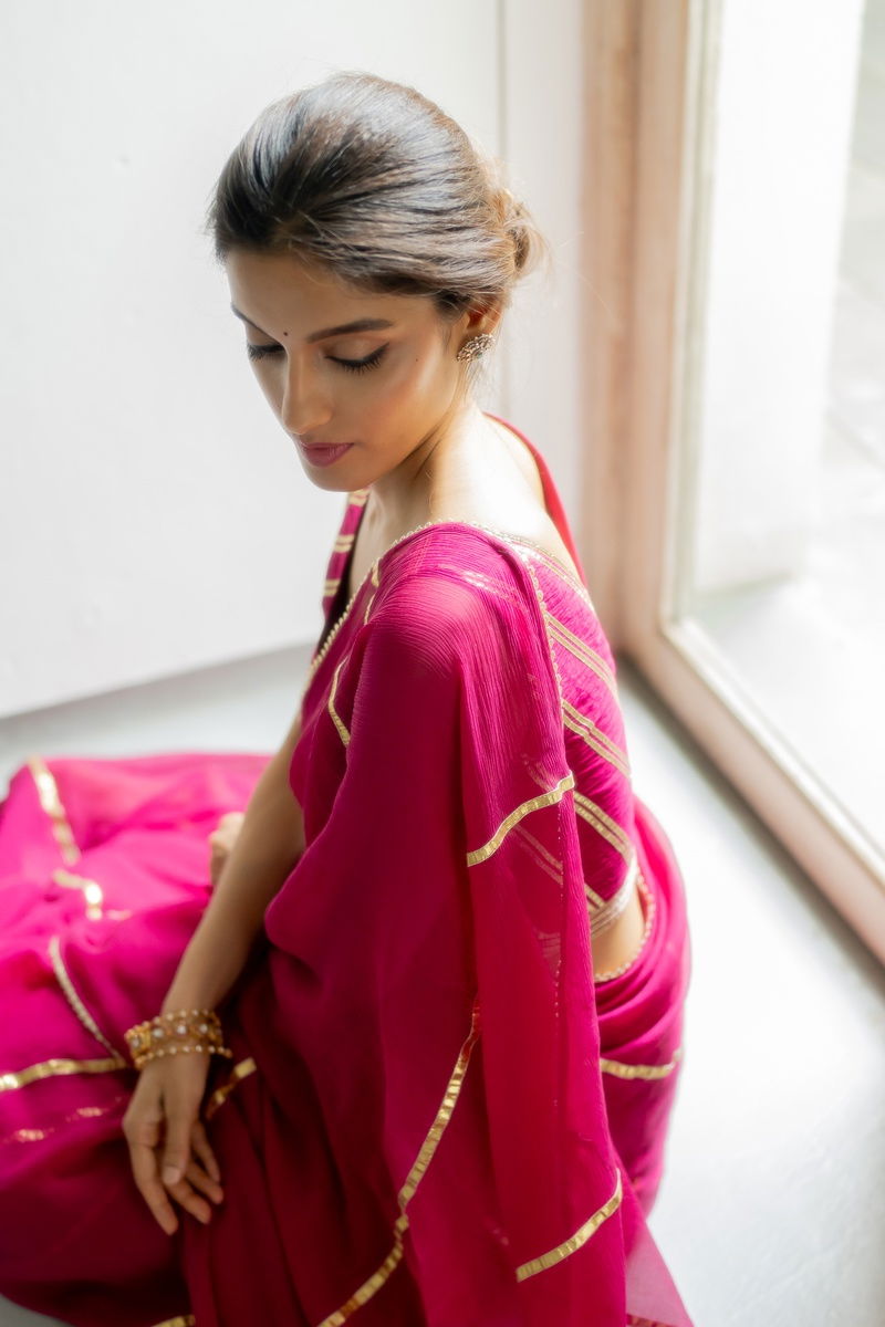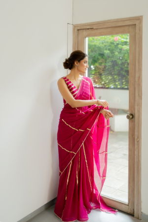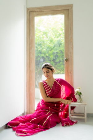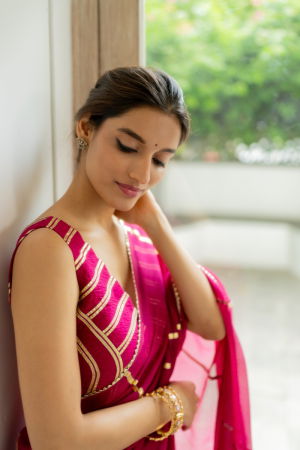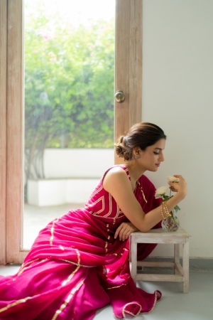 Contents | Immerse yourself in the elegance of this Hot Pink Gota Patti Choli & Sari. The intricately embroidered choli and the sari combine to create a mesmerizing ensemble that embodies grace and sophistication |