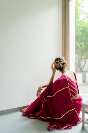 The DHARA CHIFFON SAREE, part of the exclusive Mutiyar collection by Peeli Dori, showcases a stunning Peacock Pink hue that blends elegance with a touch of modern vibrancy. Crafted from a luxurious blend of pure chiffon and raw silk, this saree offers a lightweight, fluid drape that enhances movement and comfort, making it ideal for extended wear. The intricate gota work adds a refined texture and dimension, highlighting traditional craftsmanship with a contemporary twist. Enhanced through organic dying and textile manipulation techniques, the fabric retains its natural luster and depth of color, ensuring a timeless appeal. Designed with a slim fit, the saree flatters the silhouette while maintaining ease of movement. Perfect for a range of occasions, from festive celebrations and weddings to engagements, receptions, brunches, and even as a part of a trousseau, this saree seamlessly transitions across settings. Its sophisticated design and premium materials make it a standout choice for the discerning wearer who values both artistry and quality.