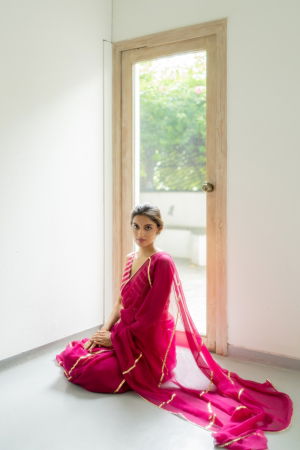Hot Pink is a vibrant and bold color that is often associated with passion, energy, and excitement the combination of hot pink and gota work creates a beautiful and elegant look that is perfect for any occasion.