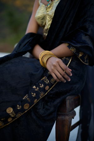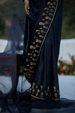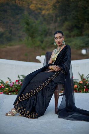 Edan Black Velvet Saree, Velvet Saree, Black Saree, Luxury Fashion, Elegant Drape, Party Wear, Evening Wear, Festive Attire, Wedding Saree, Timeless Beauty, Ethnic Fashion, Traditional Wear, Graceful Drape, Opulent Style, Sophisticated Look