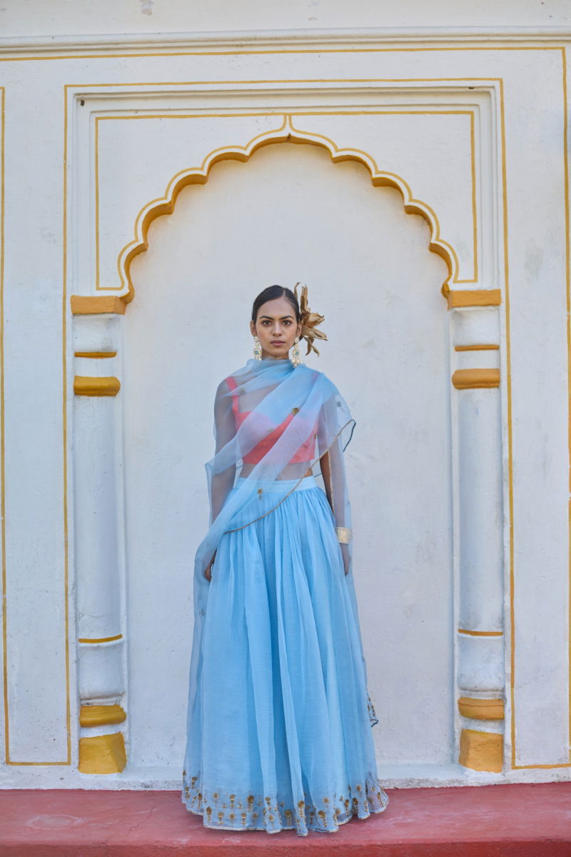 The Edan Lehanga Set from the Mehadil collection exemplifies refined craftsmanship and contemporary grace, presented in a serene powder blue hue. Crafted from luxurious silk organza, the ensemble features a slim-fit silhouette that accentuates the wearer’s form with subtle elegance. The lehenga is thoughtfully designed with a flowing drape, enhanced by delicate hand embroidery that adds texture and dimension without overwhelming the fabric’s natural sheen. The matching choli is adorned with intricate detailing, reflecting the artistry of organic dyeing and textile manipulation techniques that ensure each piece is unique and sustainably produced. A complementary dupatta, seamlessly coordinated in color and design, completes the look with a touch of sophistication. Ideal for weddings, mehandi ceremonies, sangeet events, cocktail gatherings, and festive parties, this set offers versatility and timeless appeal. Paired with silver jewelry, it delivers a polished, elegant aesthetic perfect for making a lasting impression on any occasion.