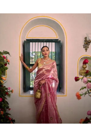The Eloise Pink Tissue Saree is a stunning piece that exudes elegance and sophistication. Made from the lightweight and lustrous tissue fabric, this saree features a delicate sheen that gives it a graceful, ethereal appearance. The soft pink color adds a feminine and soft touch, making it perfect for formal events, weddings, or festive occasions.