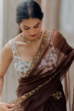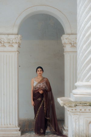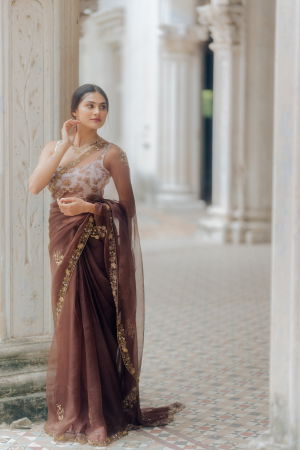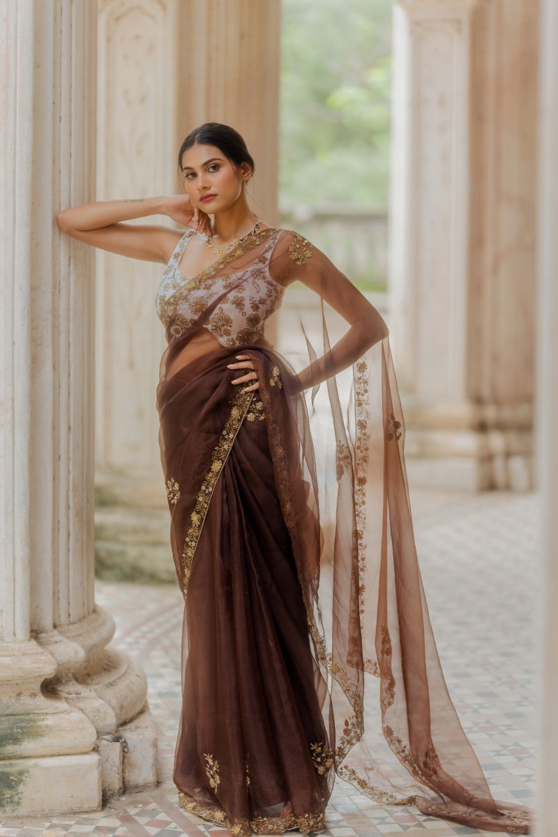 Luxurious Elegance Personified: Brown Organza Saree with Zari and Dabka Embroidery