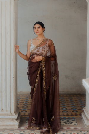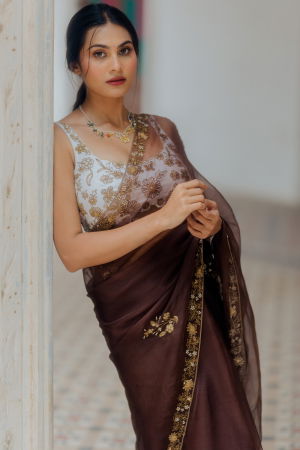 Introducing the exquisite Brown Organza Saree, a perfect blend of elegance and style. Made from high-quality organza fabric, this saree offers a luxurious feel and a stunning appearance. The rich brown color adds a touch of sophistication, making it an ideal choice for various occasions.