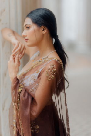 Embrace the epitome of grace and elegance with our Brown Organza Saree, adorned with delicate dabka embellishments. Every shimmering dabka stitch is handcrafted to perfection, showcasing the skilled expertise of our artisans. The intricate embellishments create a captivating visual tapestry, adding depth and allure to the saree. With its subtle yet eye-catching sparkle, this saree ensures you will be the center of attention at any event. Revel in the exquisite beauty of this saree, designed to make you feel like royalty.