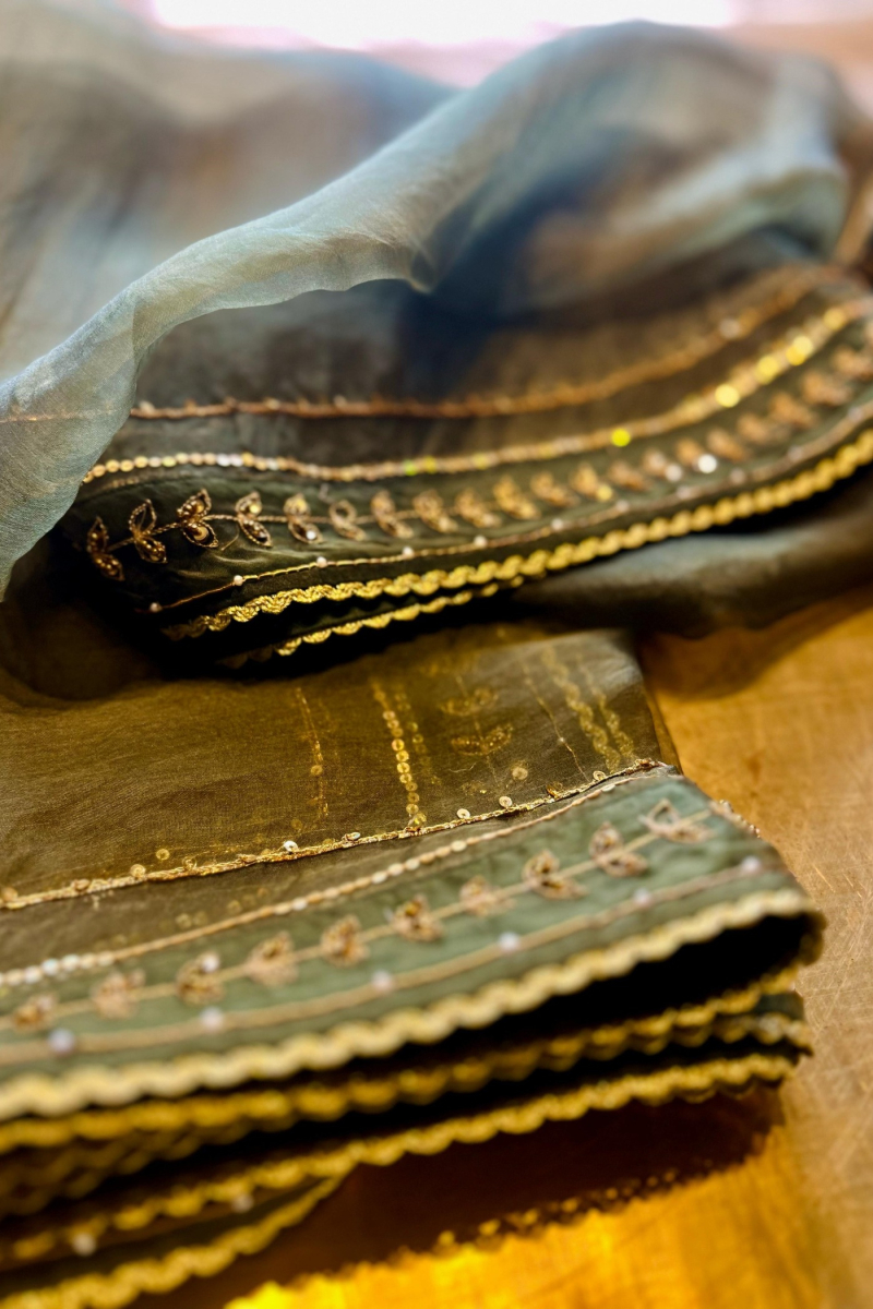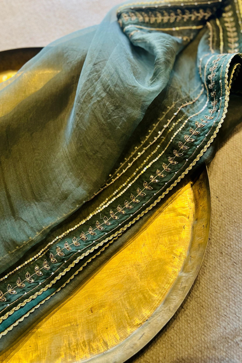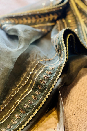The stunning beauty of an Olive green dupatta embellished with intricate hand embroidery in gold evokes a sense of classic charm and grandeur. The vibrant shade of lime signifies warmth, enthusiasm, and creativity, while the shimmering golden threads lend an element of opulence and luxury.