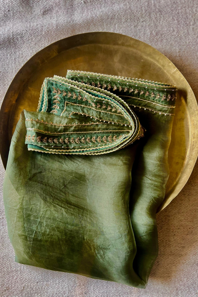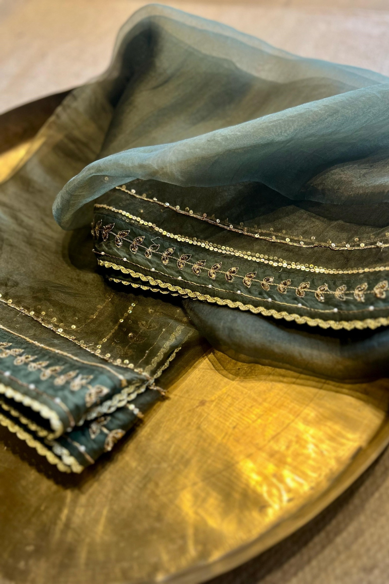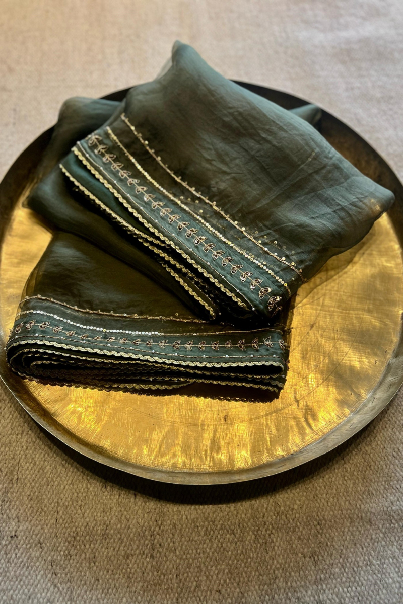 The GITA DUPATTA, a distinguished piece from the Mehafil collection, showcases the timeless elegance of olive green silk organza, meticulously crafted to reflect both heritage and modern sophistication. Adorned with intricate hand embroidery in shimmering gold threads, this dupatta exudes opulence and refinement, making it a perfect choice for a variety of occasions including weddings, sangeet, mehandi, engagement ceremonies, and festive gatherings. The vibrant lime undertone of the olive green hue, achieved through organic dyeing, adds a touch of warmth and creative energy, enhancing the overall visual appeal. Designed for the discerning wearer, the dupatta blends traditional craftsmanship with contemporary aesthetics, offering a luxurious feel and a graceful drape. Its versatility makes it ideal for both formal events and relaxed lounging, while its inclusion in the 'EVERYTHING BELOW 10K' and 'New Arrival' categories highlights its accessibility and seasonal relevance. Each piece is a testament to the artistry of hand embroidery and the purity of natural dyeing, ensuring a unique and enduring statement in any ensemble.