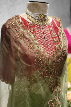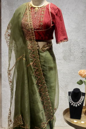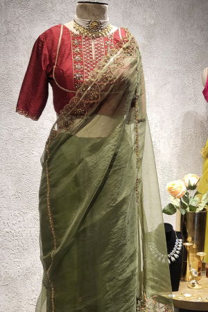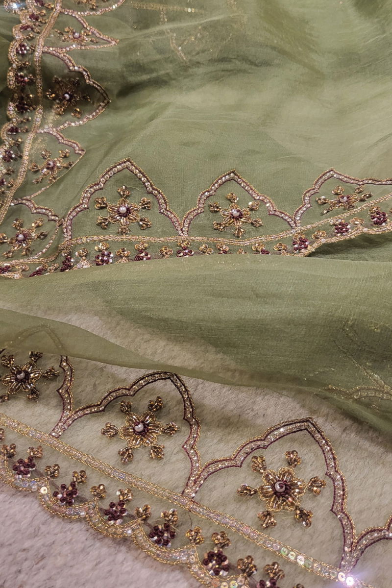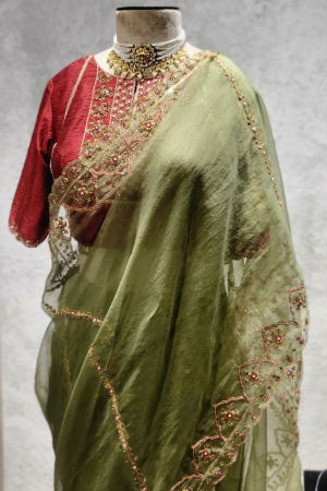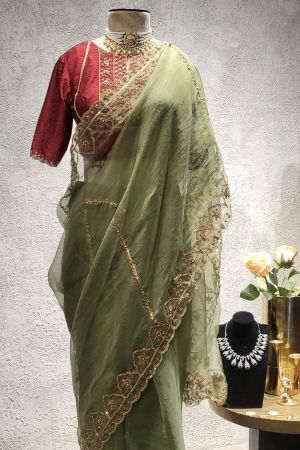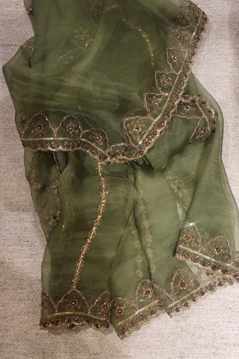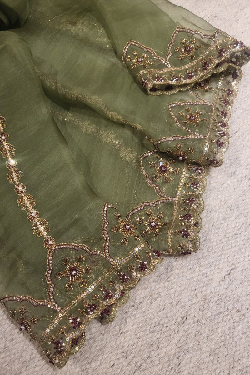 The rich hue of olive green adds a touch of sophistication, while the meticulous embroidery elevates the saree into a masterpiece of artistry. Whether worn for a special occasion or a cultural celebration, this saree exudes timeless beauty and grace, making it a cherished addition to any wardrobe.