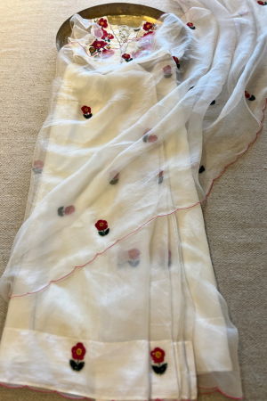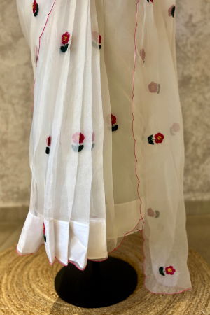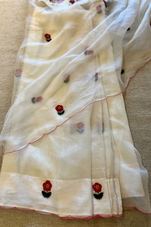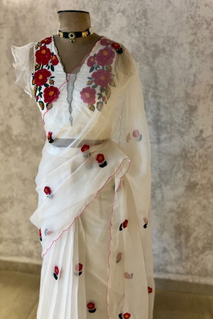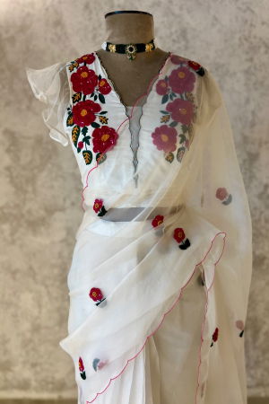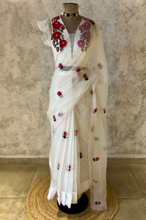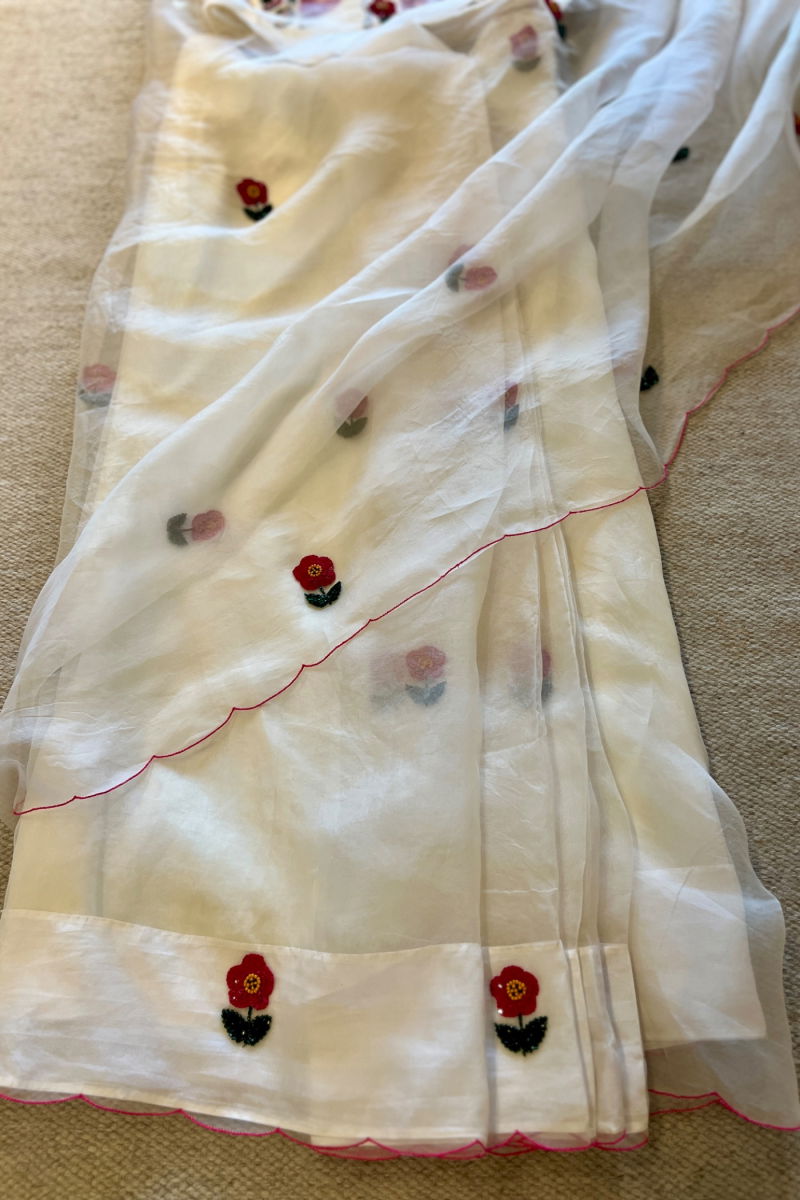 Our signature look of florals on a soft ivory. A dainty motif in beads and Resham, hand embroidered all over the saree. It's a saree that tempts you to say "Oh How Cute".