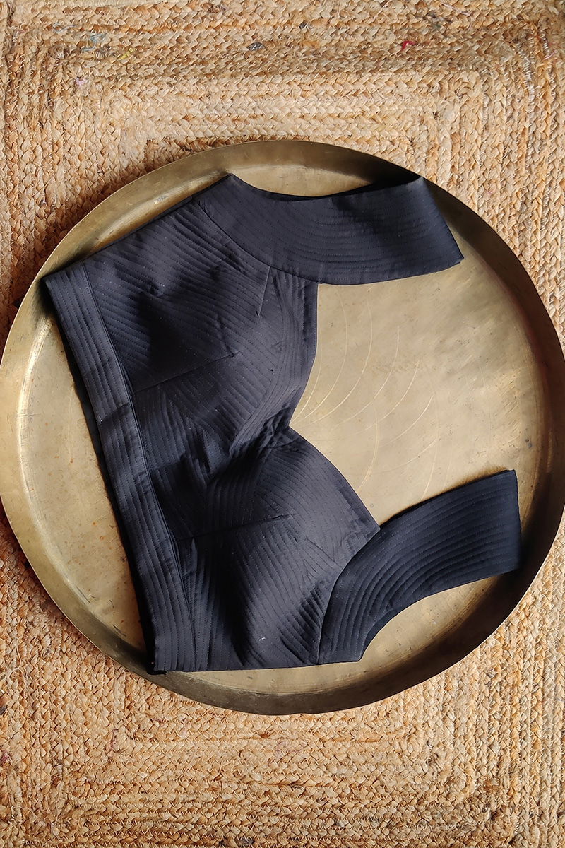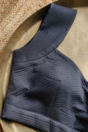 Hand quilting is one of the most satisfying surface techniques which requires just the right amount of precision to maintain symmetry and flow. This blouse is one of a kind using quilting as a technique and a flattering silhouette. This blouse is completely handmade. Sleeves can be added to the blouse on request.
