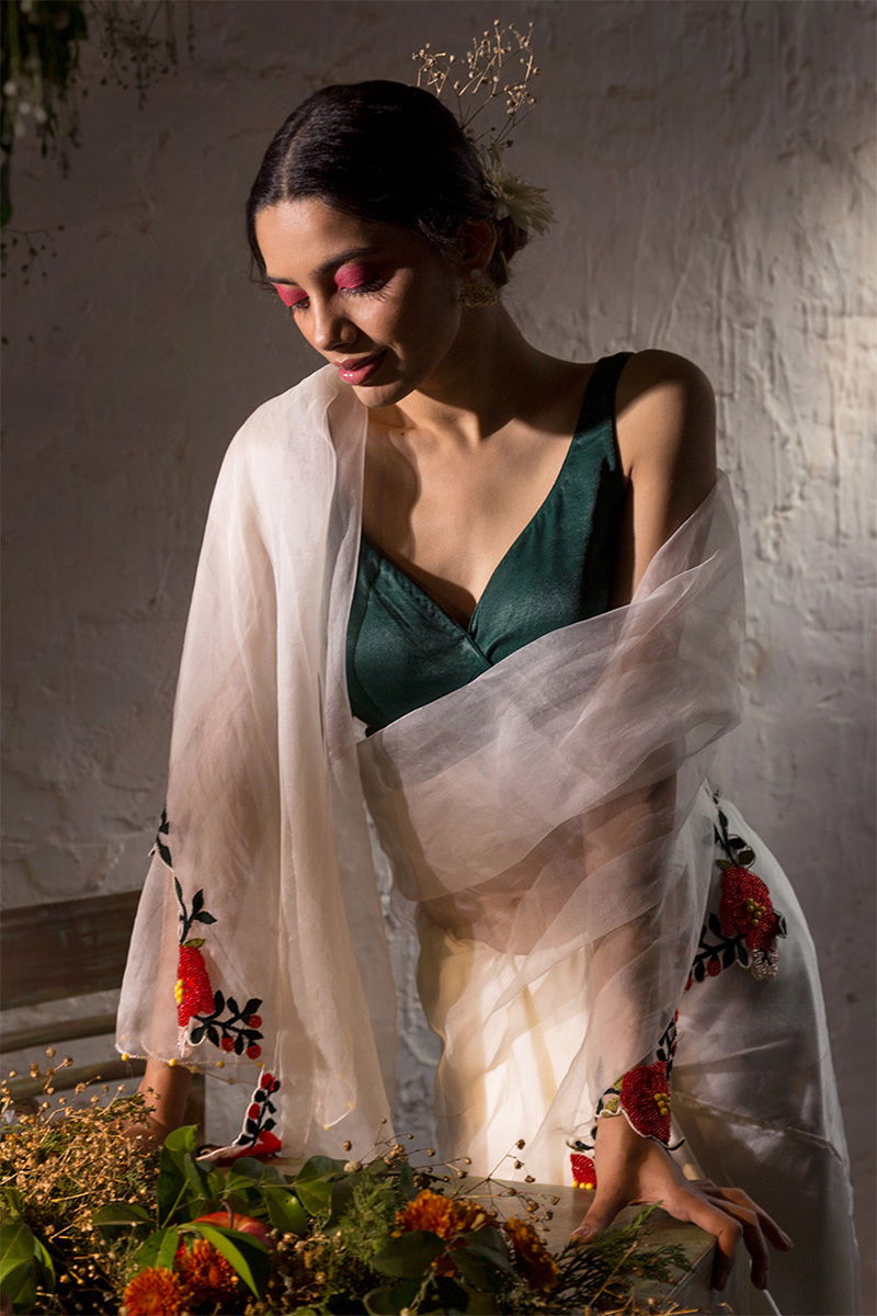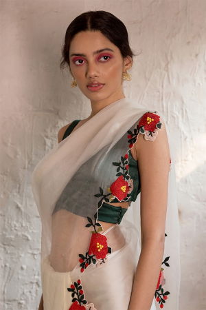 The blouse is in Moss Silk Fabric with Textile Manipulation.