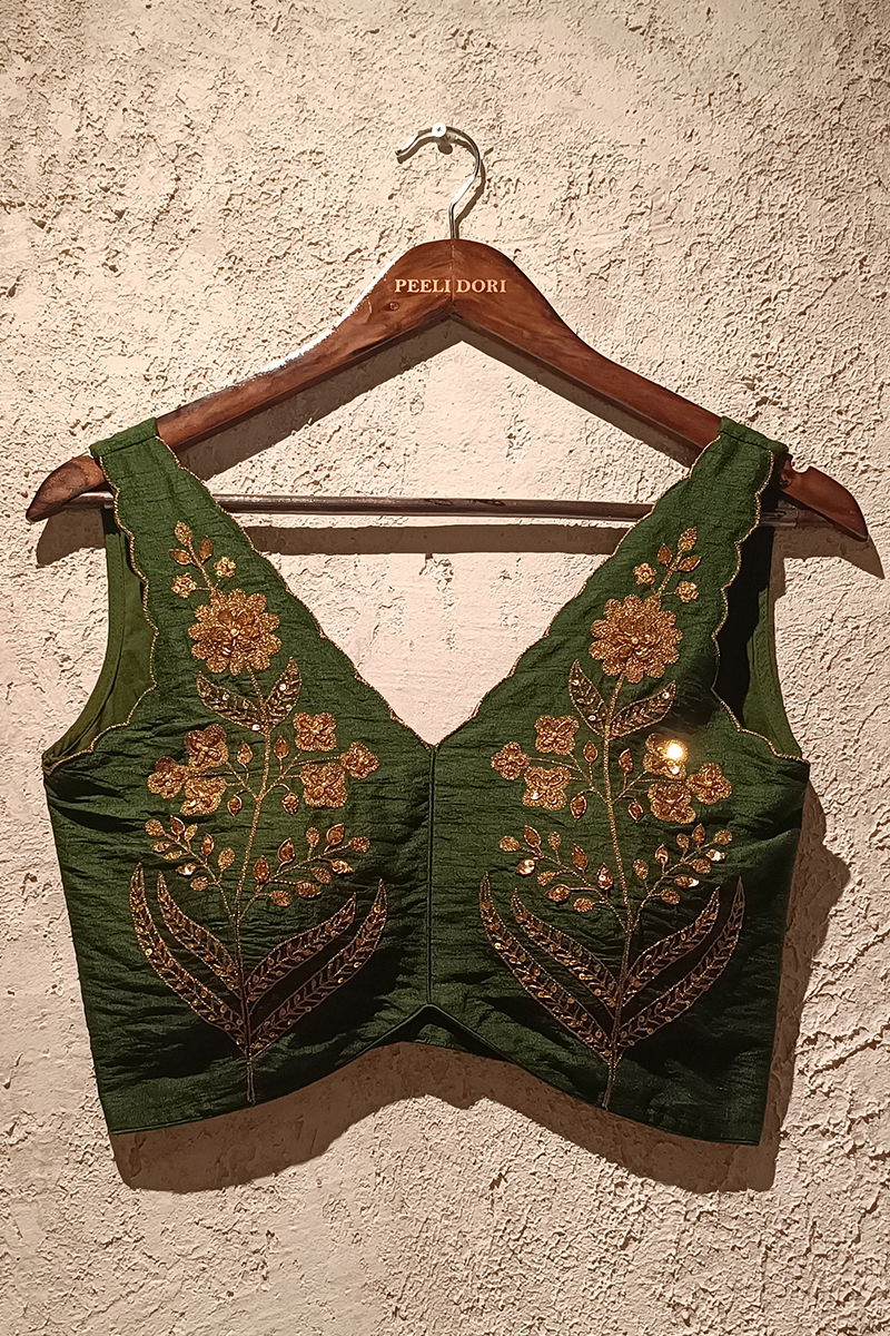 Product Description | Heeran Blouse with sequence and zardozi hand embroidery is one in classic golden embroidery detail on raw silk. The scalloped edge details give this blouse a different high altogether. |