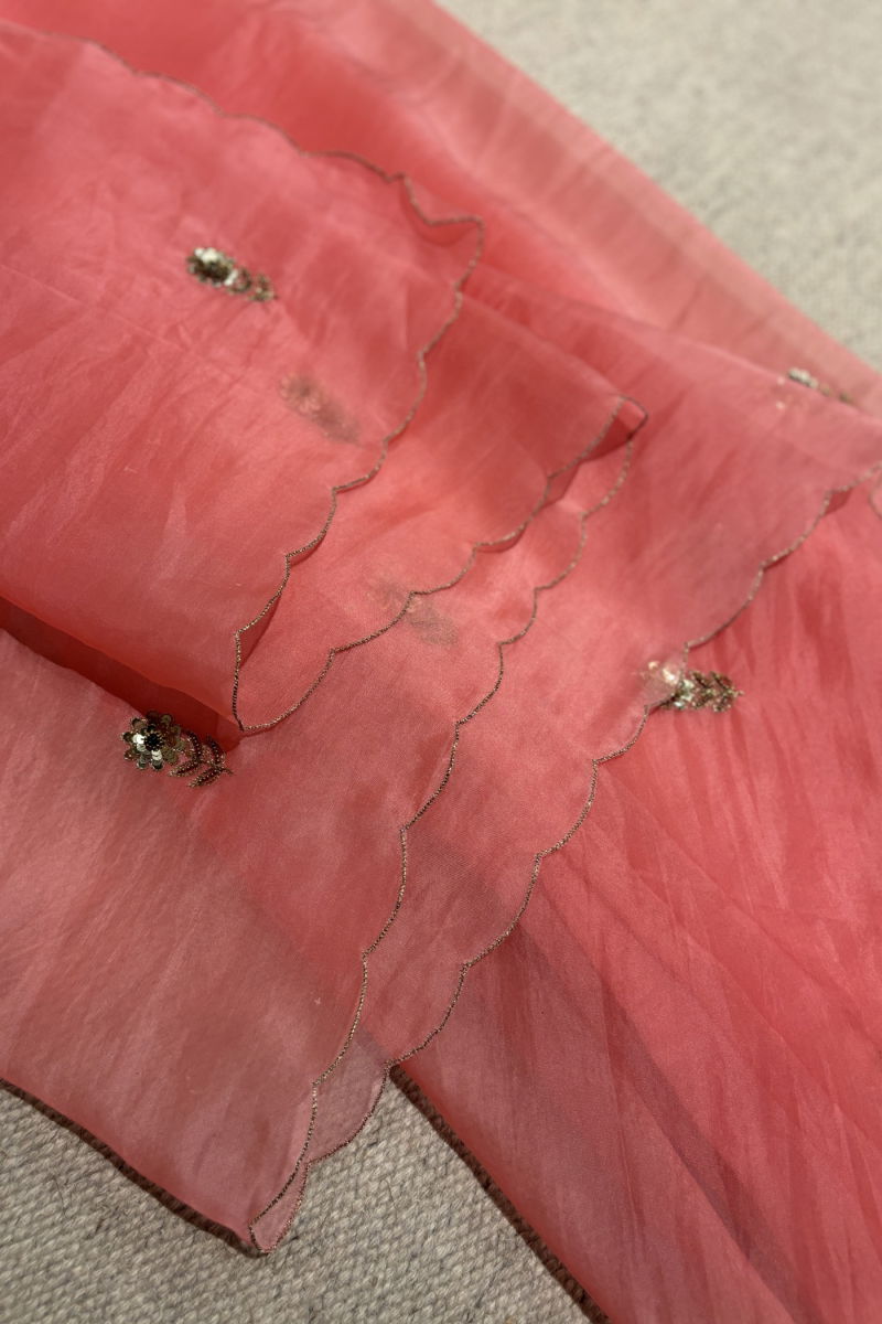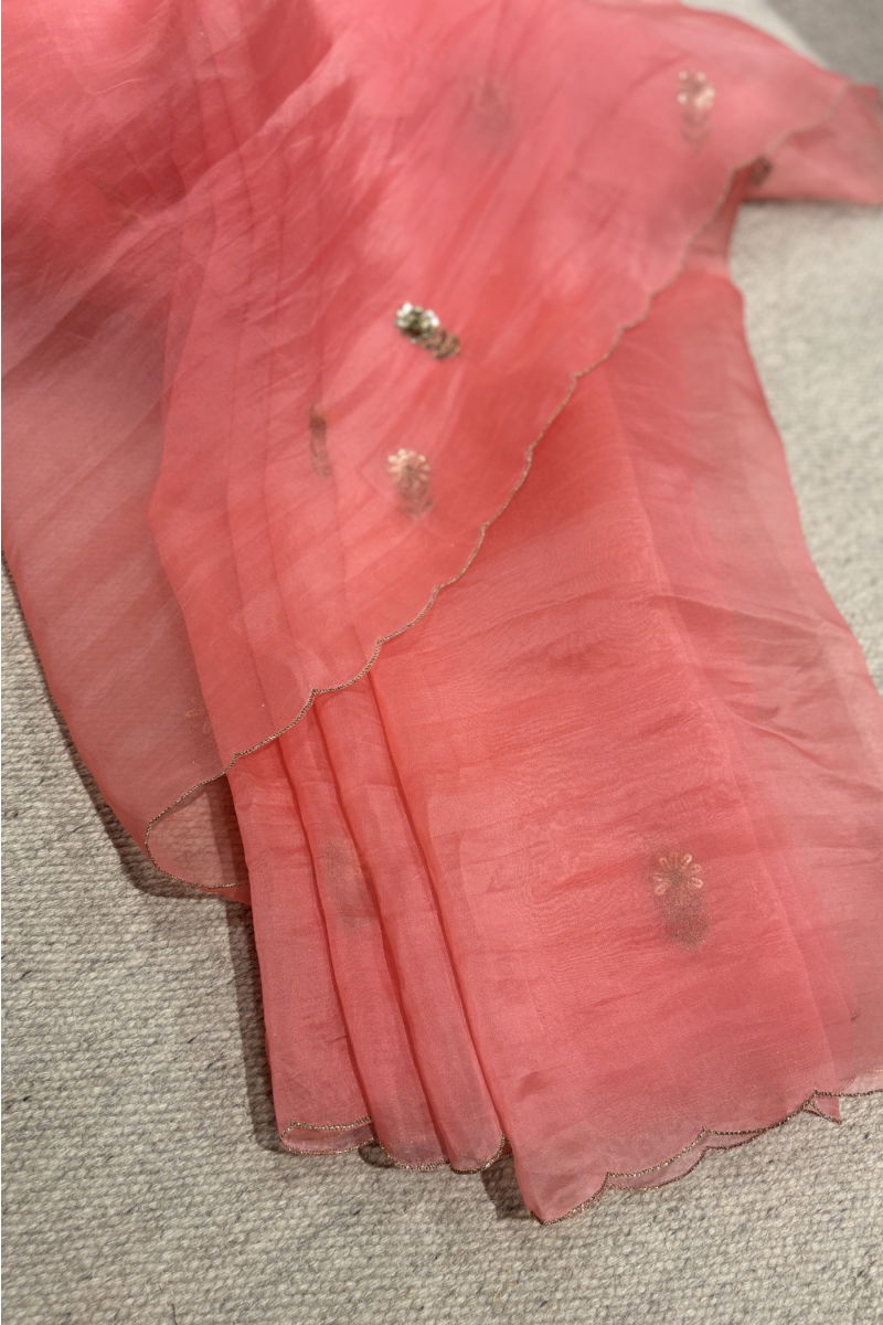 The IRIS SAREE-CORAL PINK, part of the 'Gul: A Blooming Flower' collection, is a meticulously crafted silk organza saree in a vibrant taffy pink hue, inspired by the delicate beauty of spring florals. Adorned with intricate hand embroidery featuring silver zari and beads, the design unfolds across the entire fabric, creating a luminous, dainty motif that captures the essence of seasonal blossoms. The saree features scalloped edging, adding a refined touch to its elegant silhouette. Designed with a slim fit, it drapes gracefully, offering both comfort and sophistication. Crafted using traditional techniques including hand embroidery, organic dyeing, and textile manipulation, each piece reflects a commitment to artisanal excellence. Ideal for festive occasions, weddings, cocktail parties, brunches, or relaxed lounging, this saree blends timeless elegance with contemporary style. Available in the SKU GUL55-CORAL PINK, it is a standout choice for those seeking a refined, handcrafted statement piece.