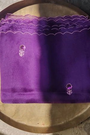 Inspired by spring florals in a Purple shade. A dainty motif in silver zari and beads, hand embroidered all over the Silk Organza saree with Scalloping details on the edging.