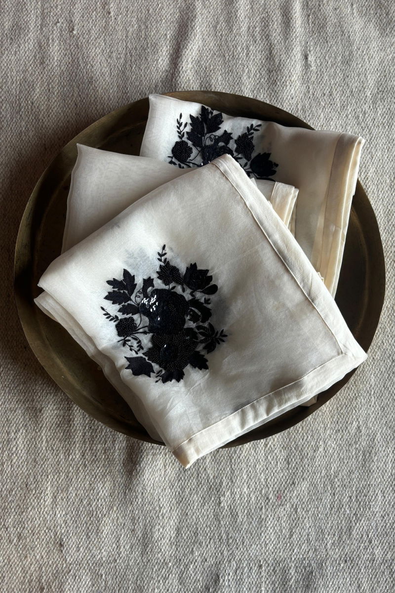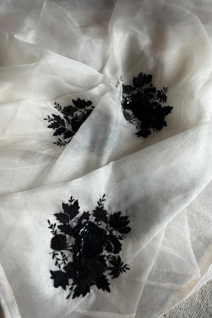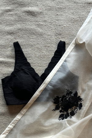 The Ivory-Black Aradhana Silk Organza Saree is a striking fusion of classic elegance and bold contrast. Featuring a pristine ivory base paired with sophisticated black accents, this saree is crafted from luxurious silk organza for a lightweight, flowing drape. The interplay between the soft ivory and dramatic black detailing adds a refined and contemporary edge, making it a perfect choice for formal and special occasions.
