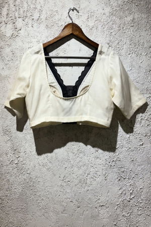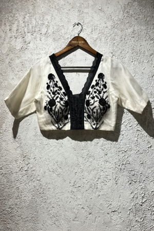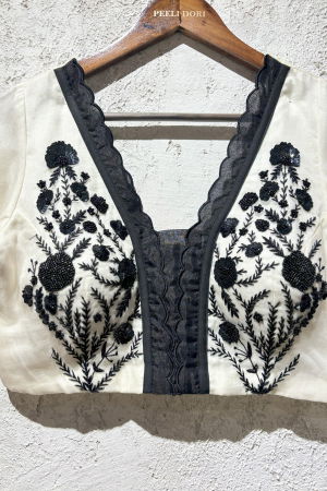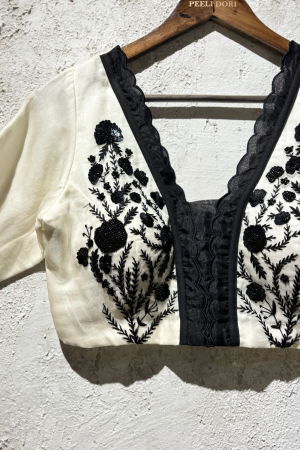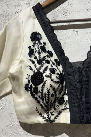 Product Description | Elevate your wardrobe with the timeless elegance of the Reet Ivory Blouse. Crafted from luxurious silk organza, this blouse features intricate classic black embroidery that brings a refined charm to its delicate, sheer fabric. The thoughtfully designed scalloped edges add an exquisite finishing touch, giving the blouse a unique sophistication and graceful movement. Perfect for both formal occasions and stylish everyday wear, the Reet Ivory Blouse is a statement piece that effortlessly blends tradition with contemporary flair. |