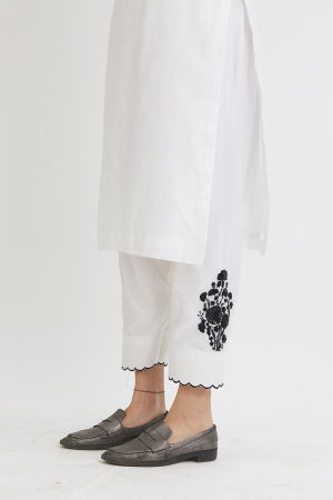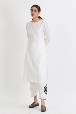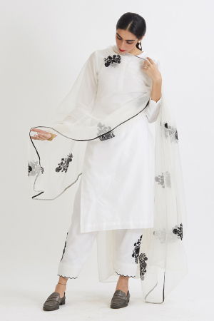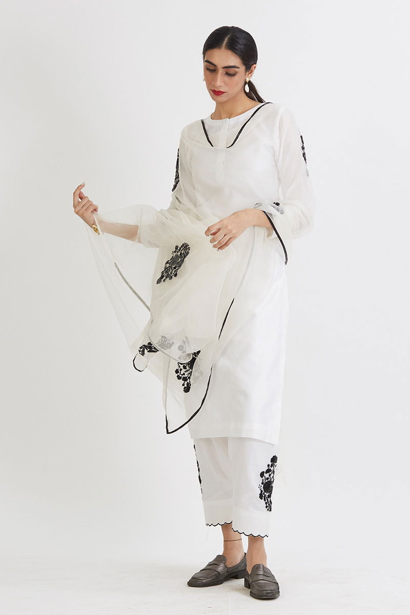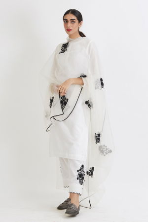 A chic detail of black and white on silk organza, this kurta set is a french floral detail of black on ivory. The dainty black florals is something to cherish. Complete this look with white perals. The kurta and pants both are relaxed fit.