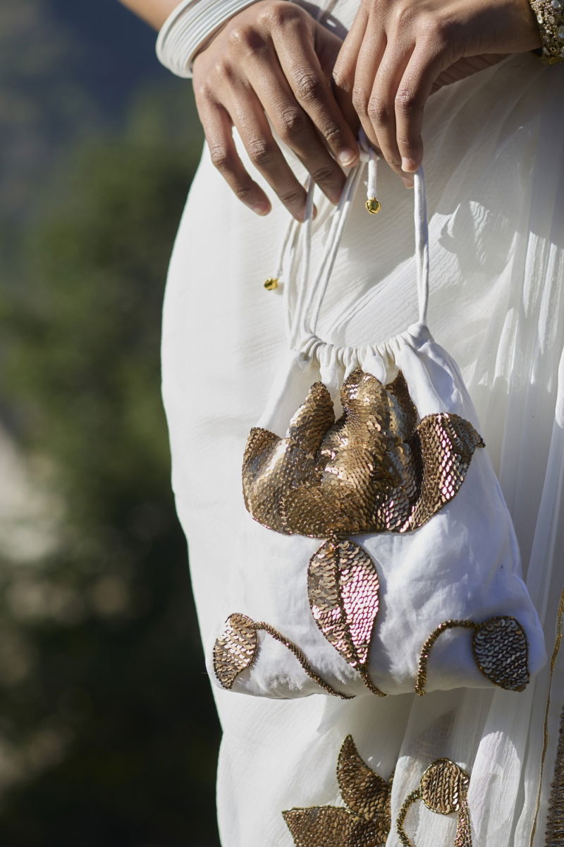 "Elegant and versatile, this Tulip Potli bag features intricate embroidery and sparkling sequins. Perfect for weddings, parties, and festive occasions, it adds a touch of glamour to any outfit. The drawstring closure and spacious interior make it both stylish and practical."