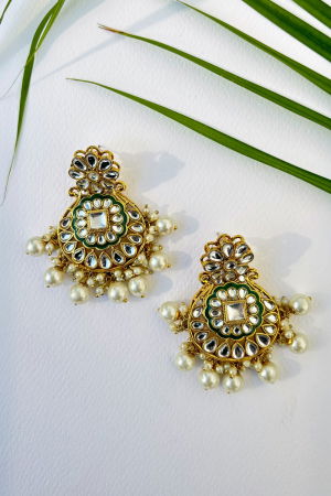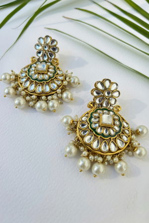 A pair of earrings, pearl, and kundan work, each secured with a back closure.