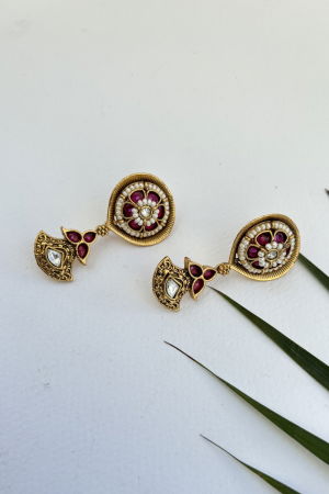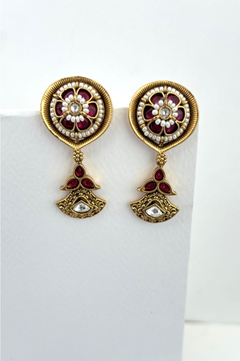 A set consists of earrings, gold toned metal with red lac, and secured with back closure