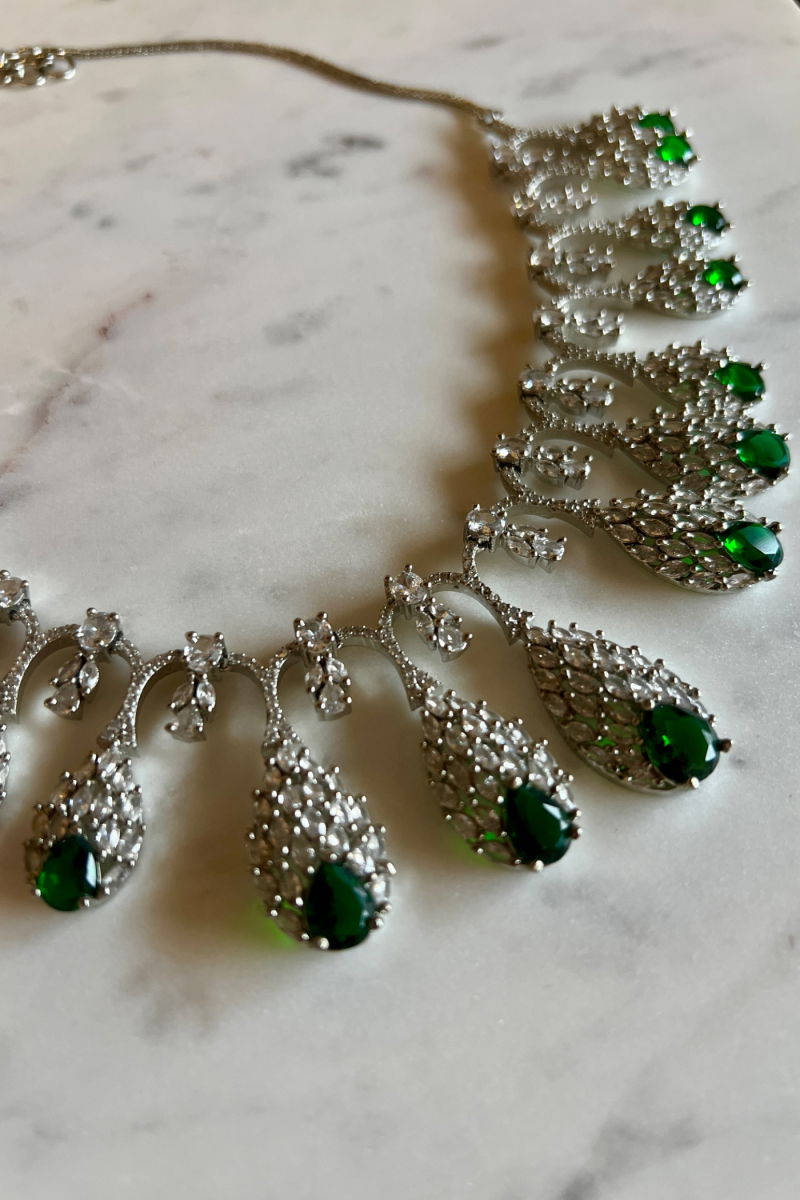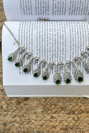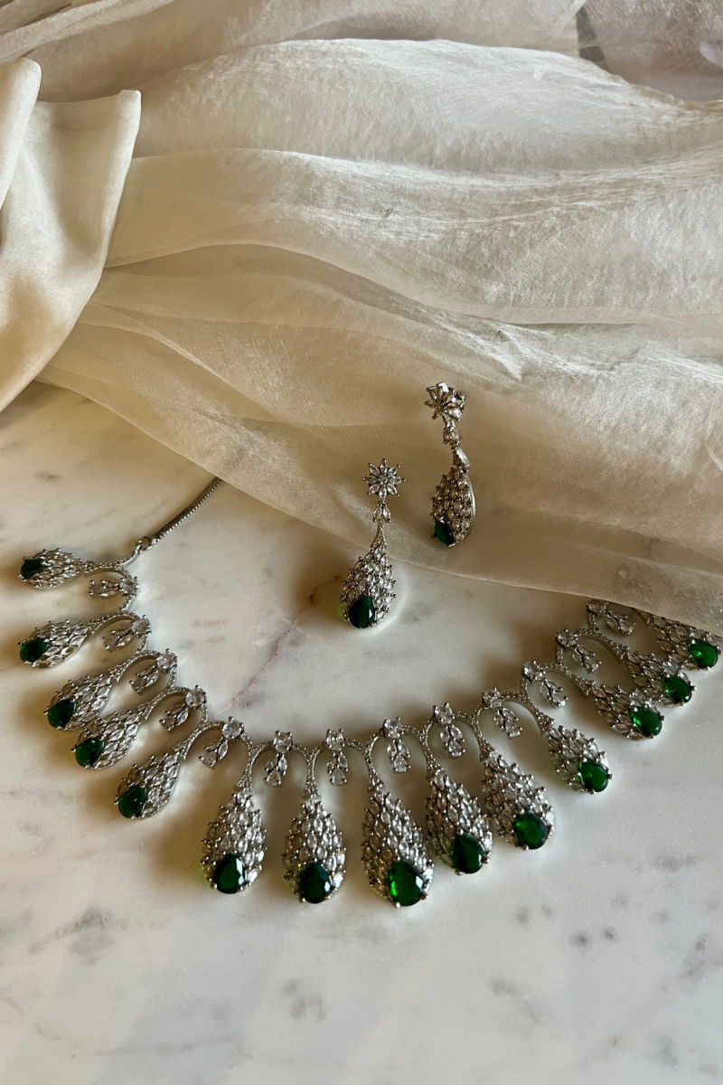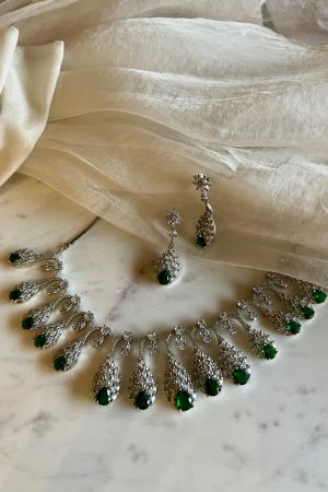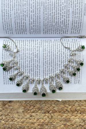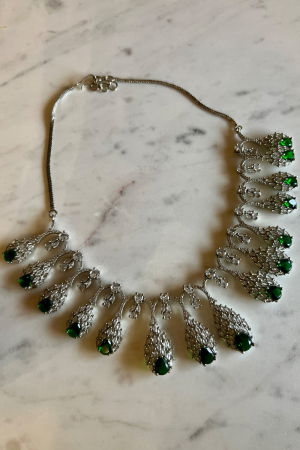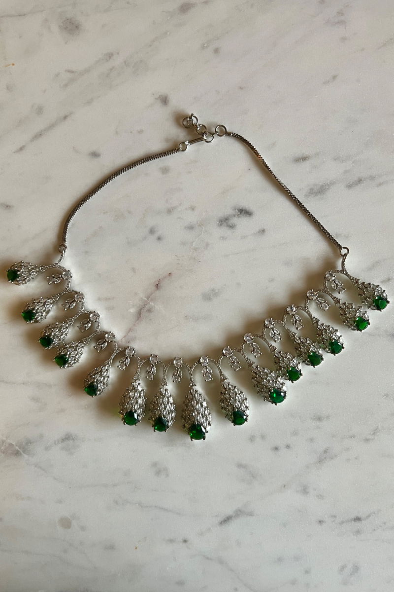 A set consists of a neckpiece, white and green artificial diamond studded and secured with a fishhook closure.