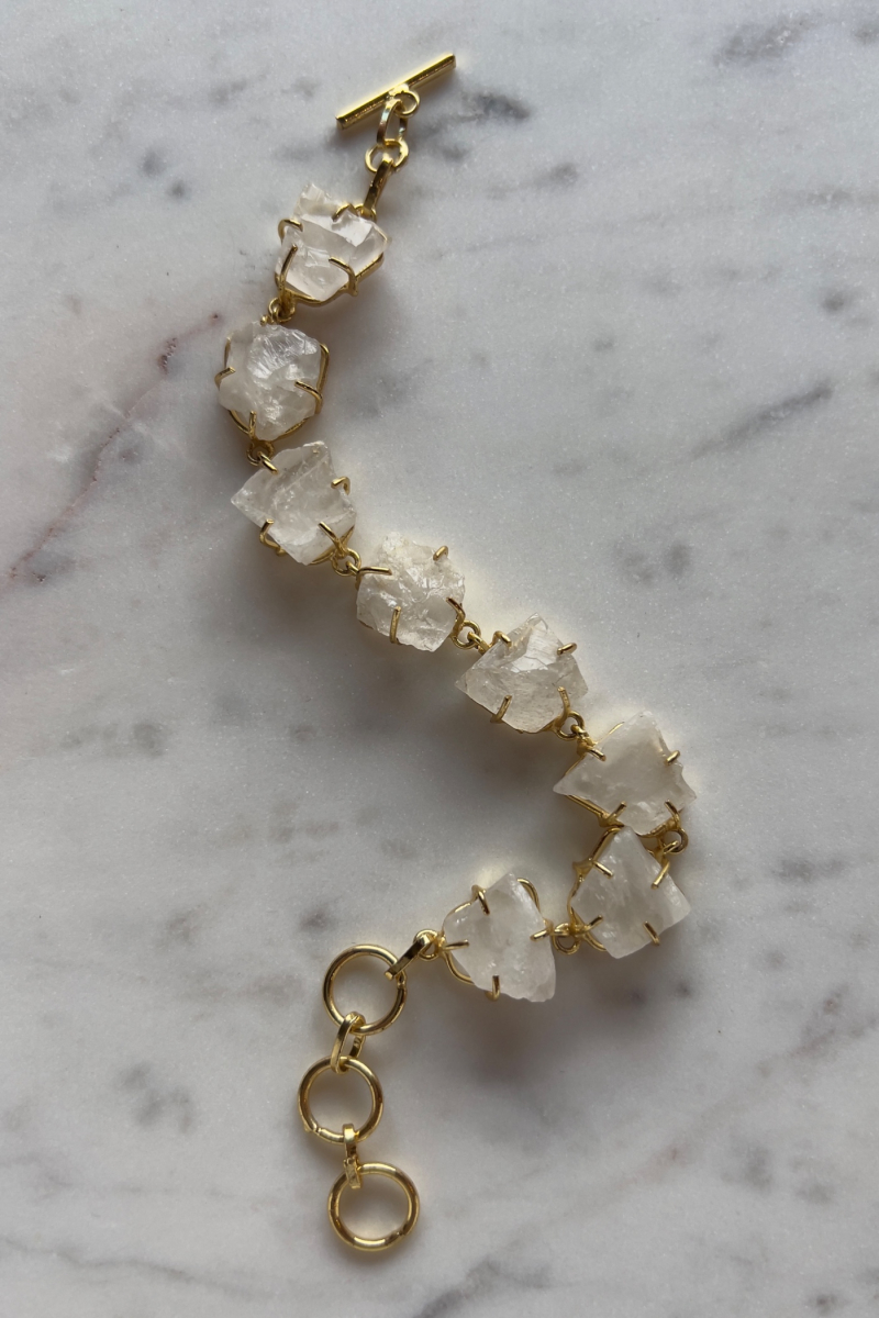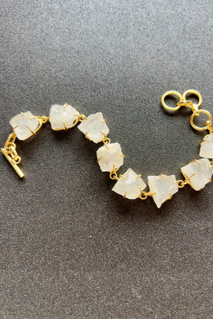 The CHHAYA BRACELET is a refined piece from the Premium Collection, thoughtfully designed for elegant occasions. Crafted with a gold-toned metal base, this bracelet features a delicate arrangement of white stones meticulously studded along its surface, offering a subtle yet radiant shimmer. The secure T-lock mechanism ensures a snug and reliable fit, making it both practical and stylish. Measuring 9cm in length and 0.5cm in width, it is designed as a free-size accessory, comfortably accommodating a range of wrist sizes. Ideal for a variety of festive and formal events, this bracelet complements attire for weddings, mehandi, sangeet, engagement, reception, bridal trousseau, cocktail gatherings, brunches, and parties. Its timeless gold hue and intricate stonework make it a versatile addition to any jewelry collection, blending traditional craftsmanship with modern sophistication.