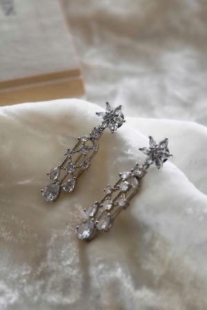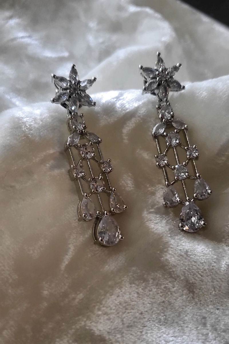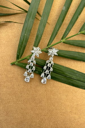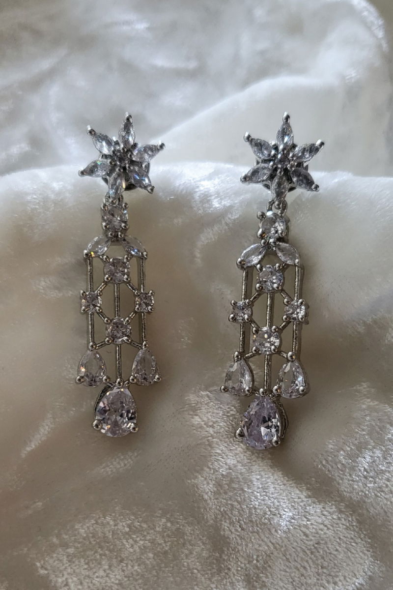 A pair of earrings, white artificial diamond studded, each secured with a back closure.