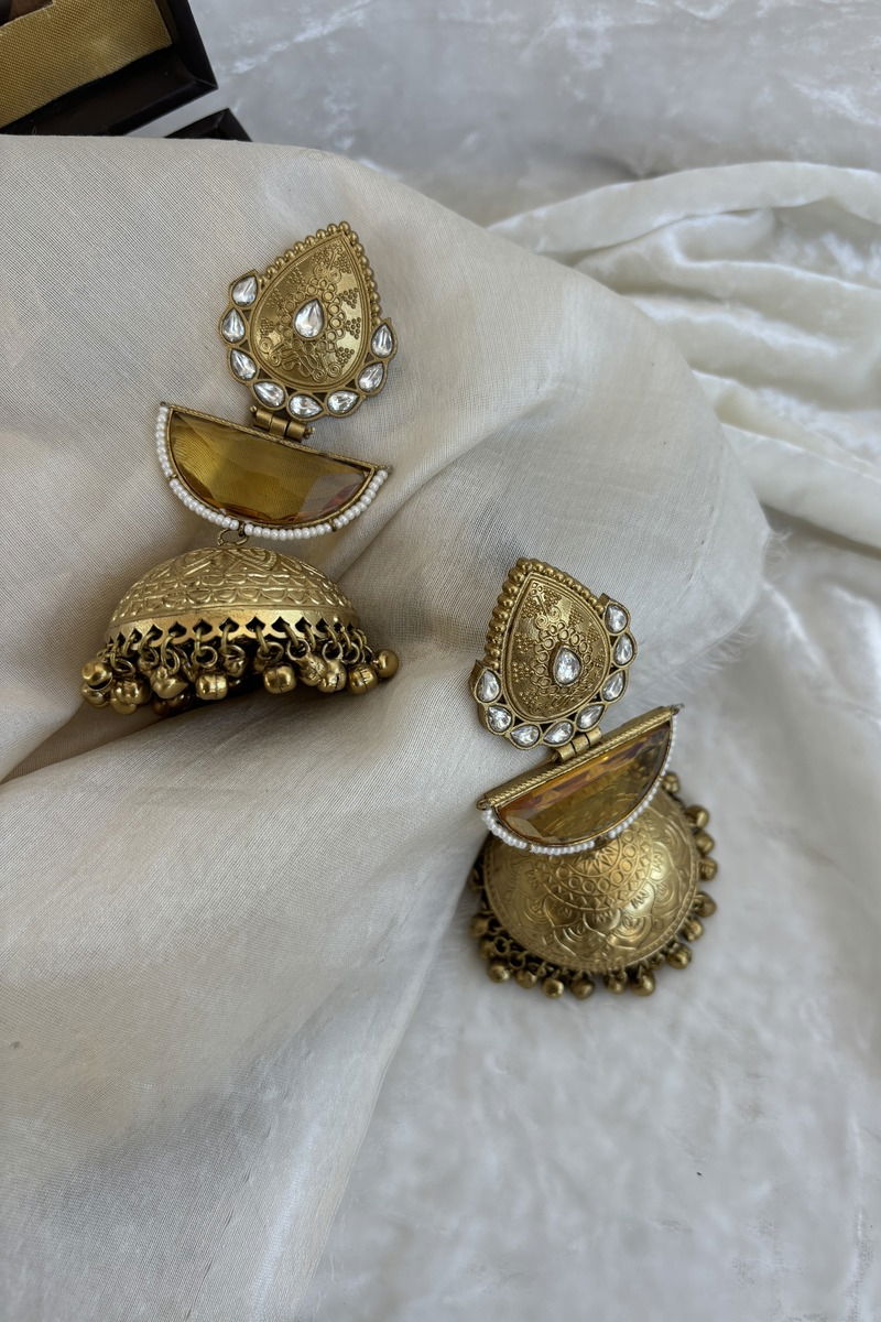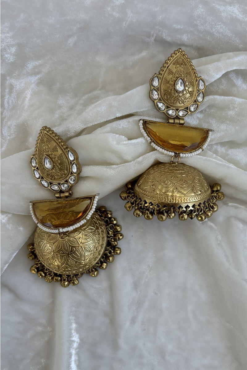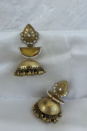 A set of earrings with a green and ivory moti design with lord engraved in it and secured with a back closure.