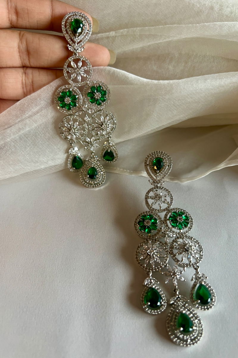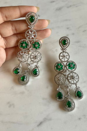 A set consists of earrings, white and green artificial diamond studded and secured with back closure.