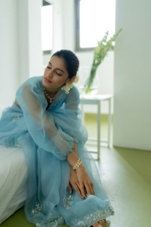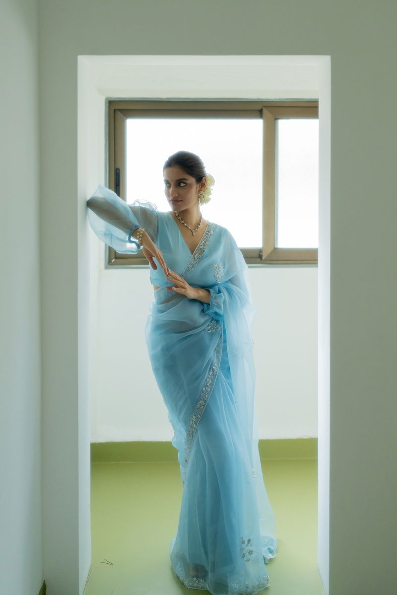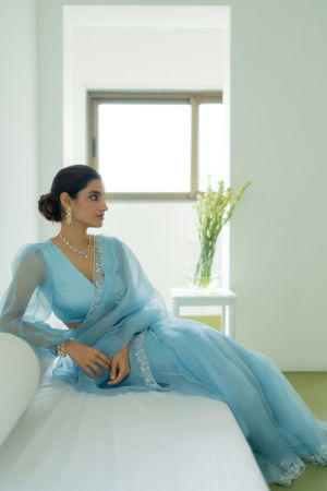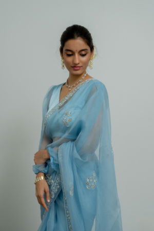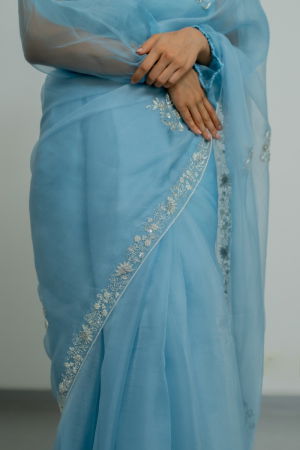 This Powder Blue colour creates a remarkable contrast making it a great choice for someone who wants to make a statement with a saree.