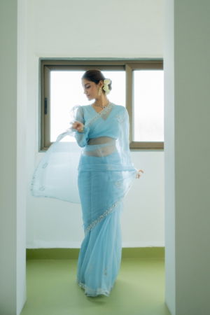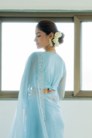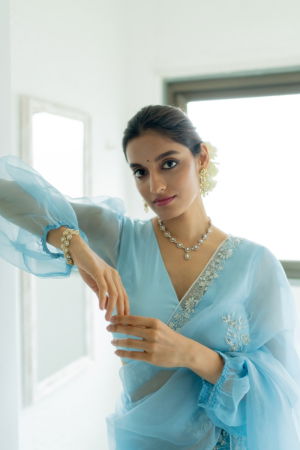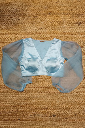 A statement blouse in powder blue color and satin body for a flattering fit.
