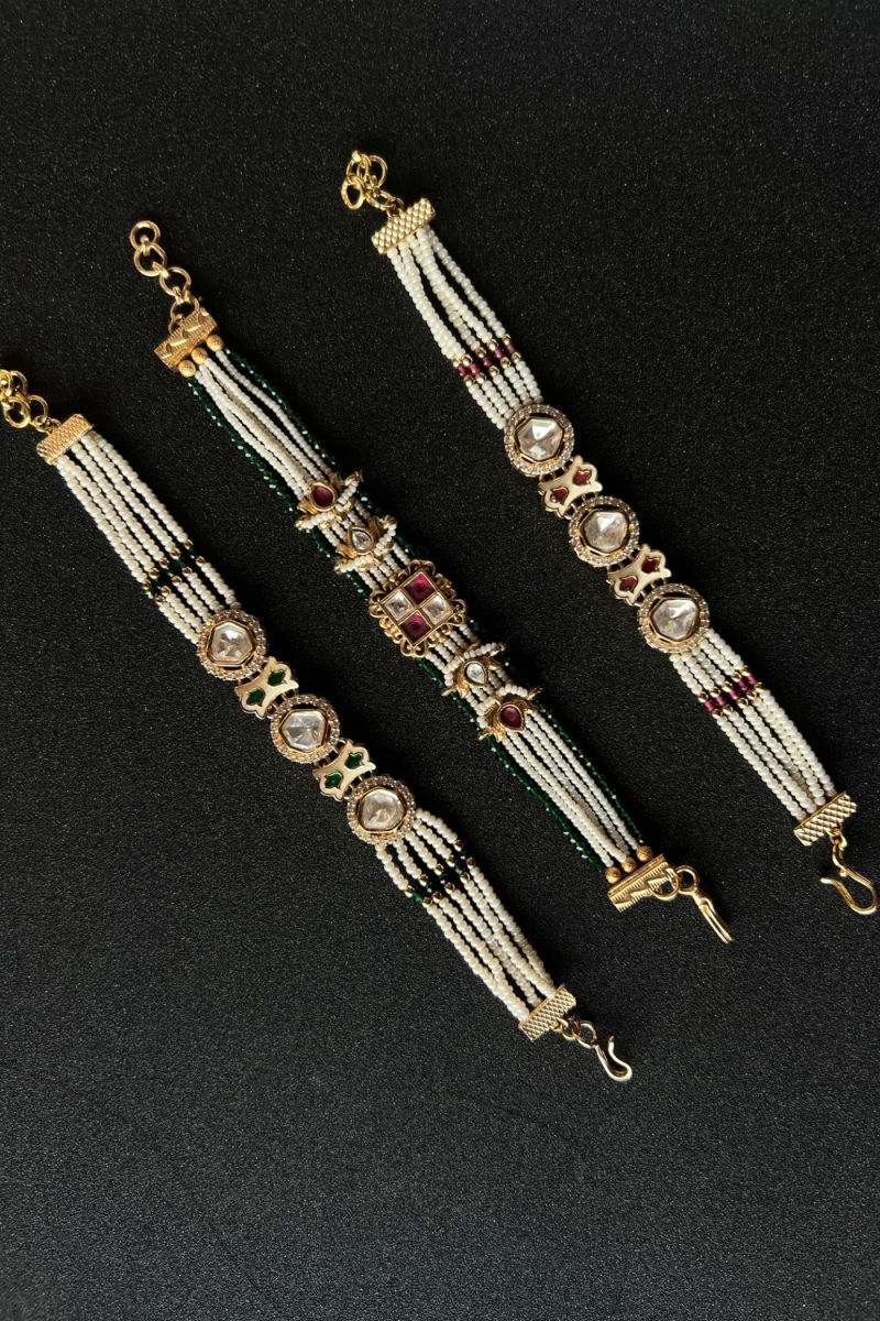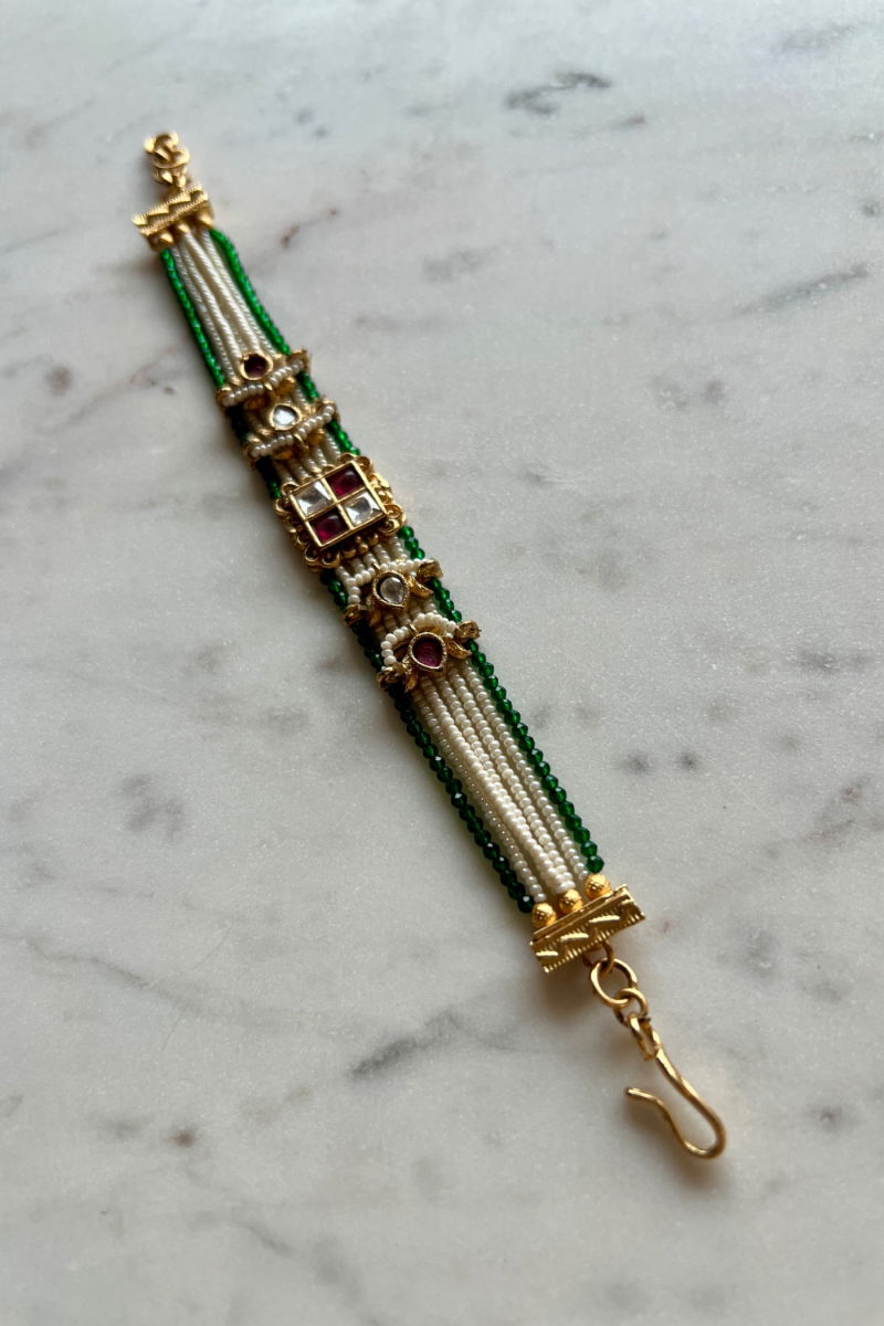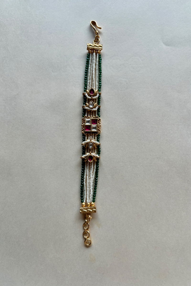 The KADA BRACELET is a meticulously crafted piece designed for elegance and timeless appeal. Composed of gold-toned metal, this bracelet features a seamless fusion of ivory pearls and vibrant green moti, creating a striking contrast that enhances its festive allure. The set includes a single bracelet secured with a mystery lock mechanism, ensuring a secure and adjustable fit for all wrist sizes. With a diameter of 9cm, it offers a balanced, comfortable wear suitable for extended occasions. Ideal for a variety of celebrations, this bracelet is perfectly suited for weddings, haldi, mehandi, sangeet, engagement, reception, brunch, and trousseau events. Its versatile design and premium material make it a standout addition to any jewelry collection. Available in a free-size fit, it effortlessly complements traditional and contemporary attire, making it a must-have for the modern woman who values both style and substance.