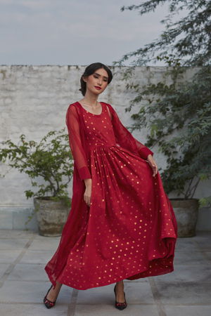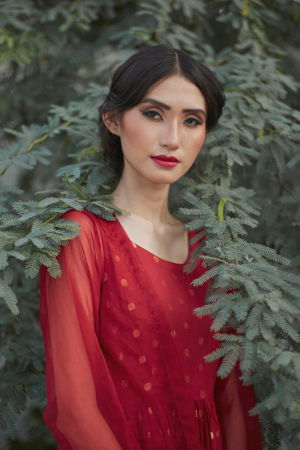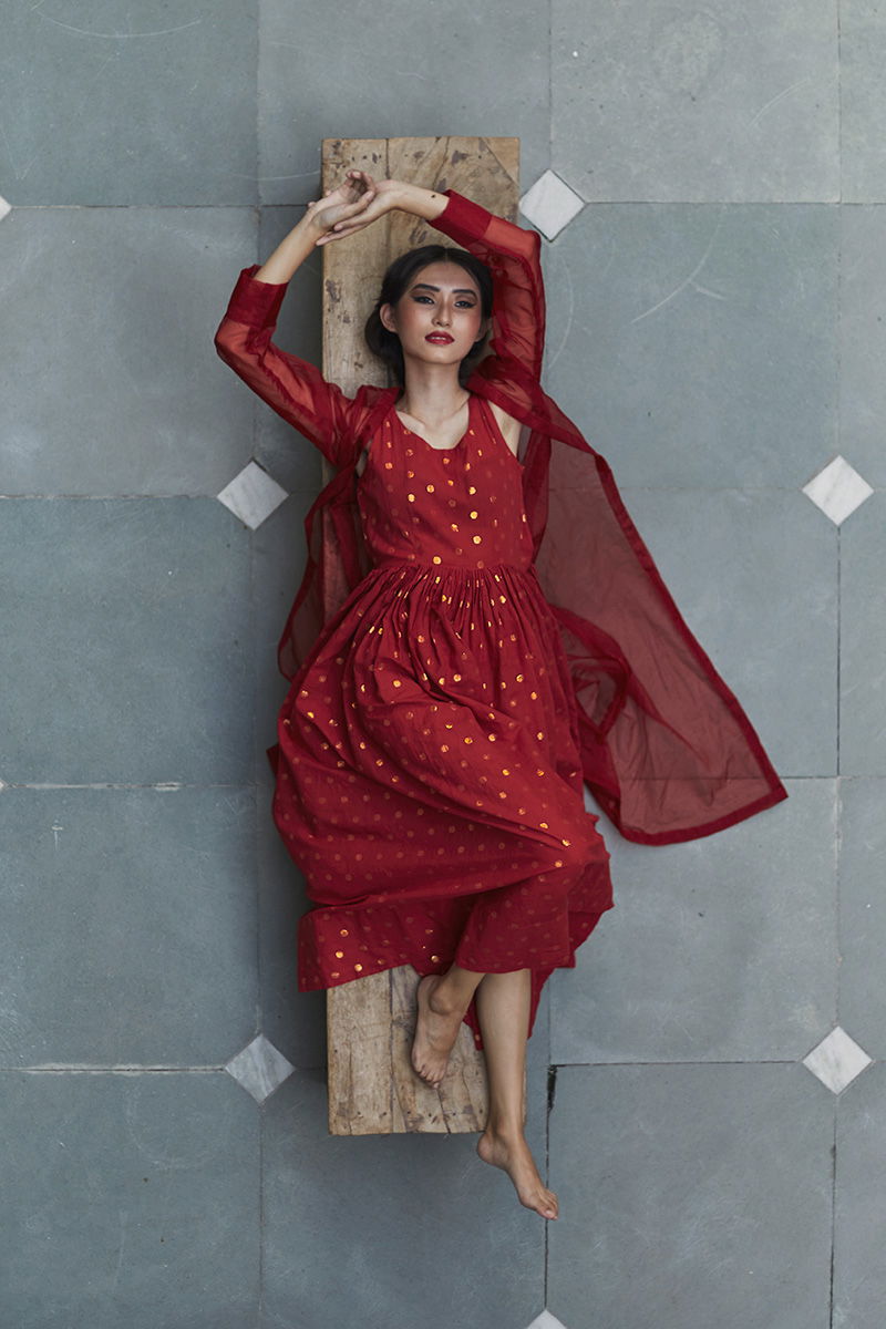 An easy-to-wear go-to festive dress with a doll-cut paired with a sheer organza shrug. This is one of our bestsellers for a young and hands-free occasion wear, perfect for both day and evening looks.