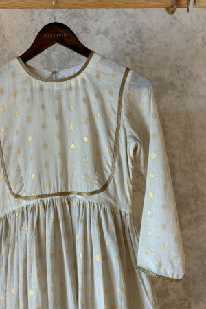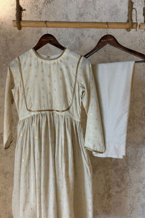 The Kiara Ivory Chanderi Anarkali features a vibrant red Chanderi fabric with a flowy, floor-length silhouette. Its design often includes intricate embroidery or embellishments along the bodice and hem, creating a rich, elegant look. The lightweight fabric provides a graceful drape, making it ideal for festive occasions or formal events.