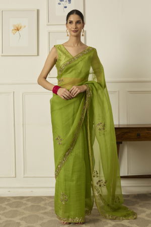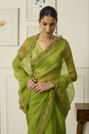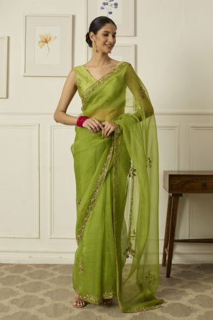Elevate your elegance with the Lime Green Meenakshi Organza Saree. Its vibrant hue adds a touch of freshness to any occasion, while the delicate organza fabric exudes sophistication. Embrace effortless style and grace as you drape this exquisite saree, making a statement wherever you go.