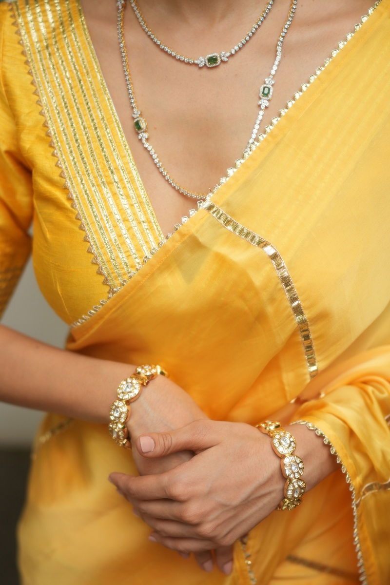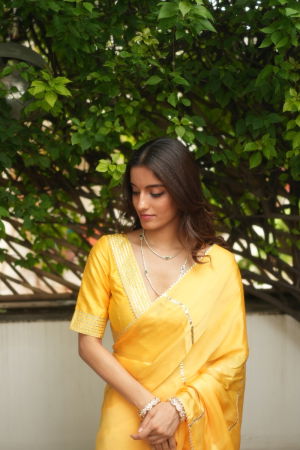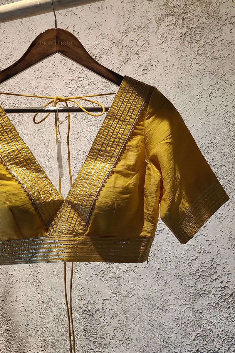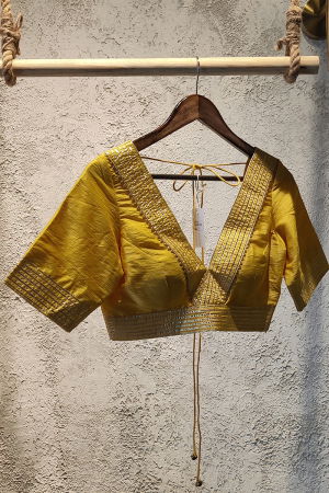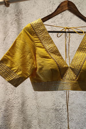 Product Description | The Deep Neckline Blouse with Gota Work is a timeless and elegant piece designed to make a statement at any special occasion. This blouse features a beautifully crafted deep neckline that adds a touch of sophistication while enhancing the overall silhouette. The intricate Gota work, a traditional embellishment, is expertly applied, adding a stunning, intricate detail that catches the light and draws attention. Gota work, known for its shimmering gold, creates a luxurious, eye-catching effect that elevates the blouse to a new level of beauty. Made from high-quality fabric, this blouse offers both comfort and durability, ensuring it feels as good as it looks. The deep neckline enhances the neckline and collarbones, creating a flattering and graceful look. Whether paired with a saree, lehenga, or skirt, this blouse adds elegance and charm to any outfit. |