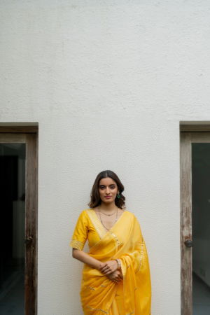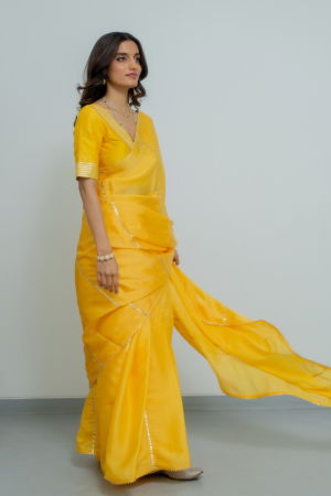 The MADHUBALA SATIN SILK SAREE, part of the exclusive Mutiyar collection by Peeli Dori, is a masterful blend of traditional craftsmanship and modern elegance. Crafted from a luxurious combination of Satin Silk and Raw Silk, this saree offers a smooth, lustrous finish with a breathable fit that ensures comfort throughout the day. Its vibrant Bumblebee Yellow hue is achieved through organic dying techniques, highlighting the natural beauty of the textile while maintaining sustainability. The saree features intricate Gota work, meticulously applied on the deep neckline blouse, adding a touch of opulence and refinement. Designed for a wide range of occasions including weddings, receptions, sangeet, haldi, engagements, cocktail events, brunches, and festive celebrations, it seamlessly transitions from formal to casual wear. The collection’s emphasis on textile manipulation and artisanal detail reflects a commitment to authentic, handcrafted excellence. Perfect for the discerning wearer, this saree is a statement of grace, tradition, and contemporary style.