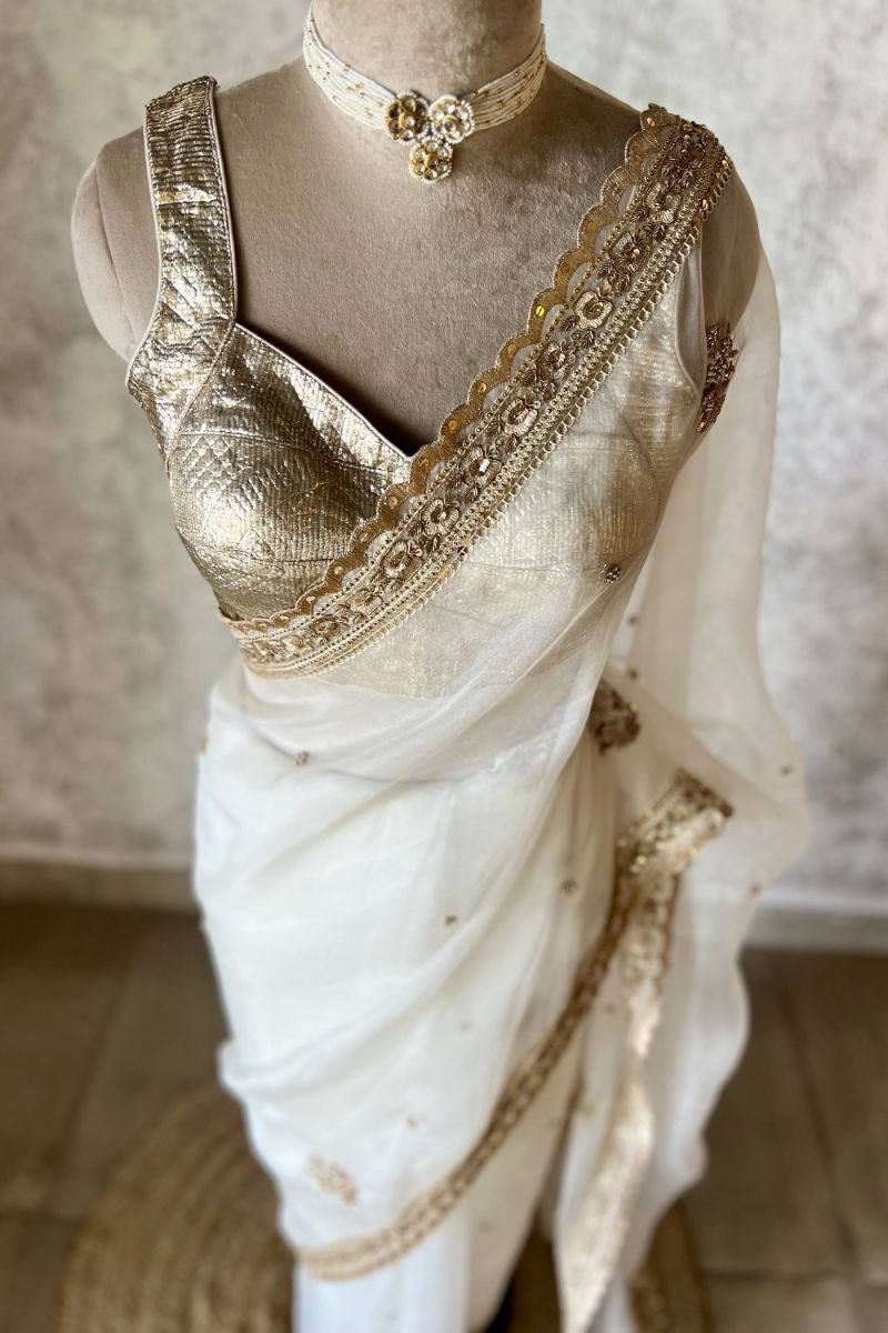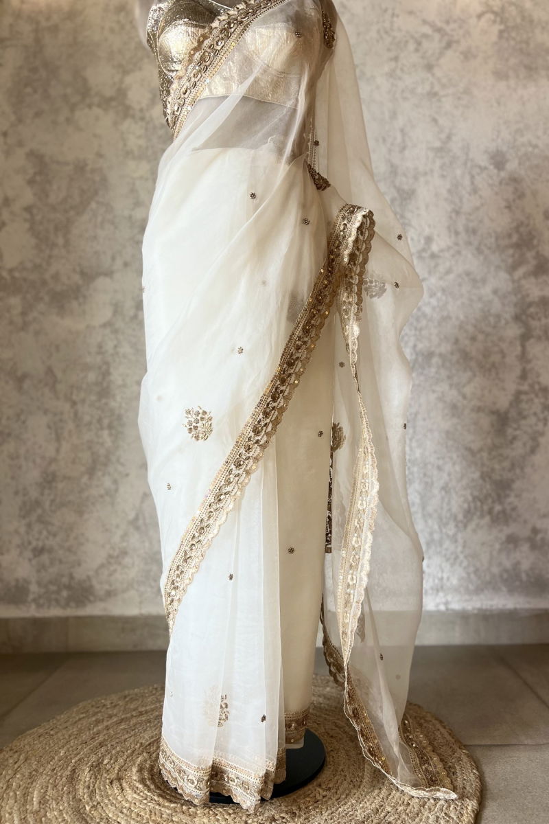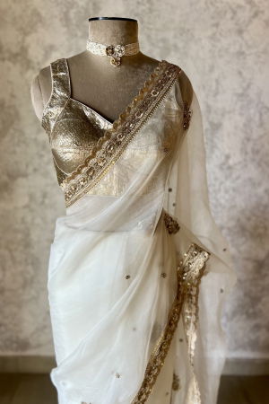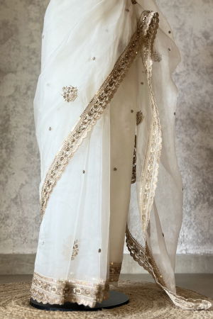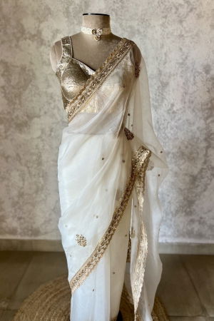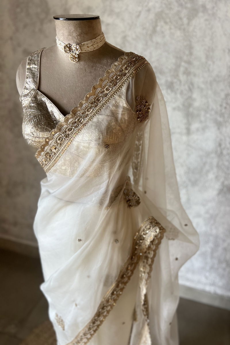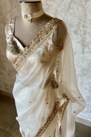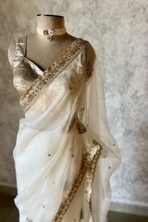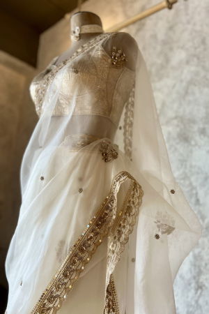 mastani ivory saree, silk organza saree, ivory organza saree, designer saree, wedding saree, festive wear, elegant saree, luxury saree, ethnic wear, traditional saree, party wear saree, embroidered saree, reception saree, statement saree, handcrafted saree, lightweight saree, classic saree, sophisticated saree, opulent saree