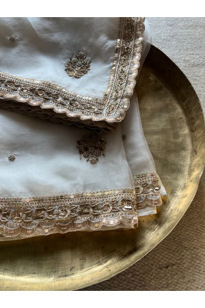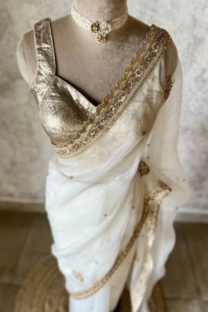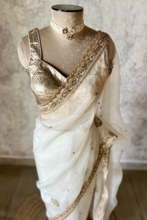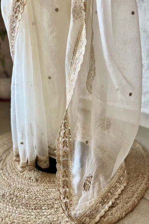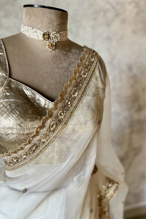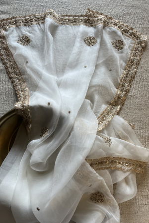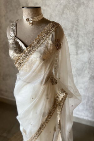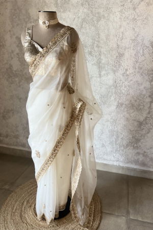 Product Description | The Mastani Ivory Silk Organza Saree is a breathtaking blend of elegance and sophistication, designed for those who appreciate timeless beauty. Crafted from premium silk organza fabric, this saree is lightweight, sheer, and effortlessly graceful, offering a delicate yet structured drape that enhances your silhouette. The soft ivory hue exudes purity and understated luxury, making it an ideal choice for weddings, receptions, festive gatherings, and special celebrations. Embellished with intricate embroidery and fine detailing, this saree showcases exquisite craftsmanship, adding a touch of opulence to its ethereal charm. Whether paired with traditional jewelry for a regal appeal or styled with contemporary accessories for a modern touch, the Mastani Ivory Silk Organza Saree ensures you make an unforgettable statement. Perfect for those who seek refined beauty, this saree is a must-have addition to your elegant wardrobe. |