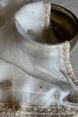 The Mastani Organza Saree is a stunning piece that embodies elegance and modern sophistication. Crafted from premium silk organza fabric, this saree boasts a delicate Ivory shade that enhances its ethereal appeal. The saree is adorned with intricate embroidery and subtle embellishments, adding a layer of exquisite detail that catches the eye. Its lightweight and sheer texture ensures a graceful and fluid drape, making it perfect for special occasions such as weddings, receptions, and festive celebrations. The Mastani Organza Saree is a perfect blend of traditional artistry and contemporary style, making it a standout addition to any wardrobe.