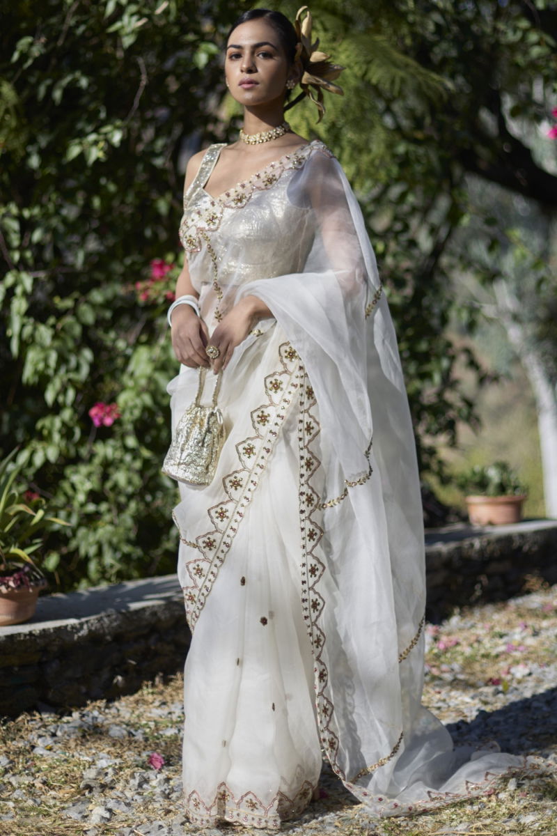 The MEHFIL IVORY SAREE, part of the exquisite Mehfal collection, is a masterful blend of elegance and craftsmanship, meticulously crafted from premium silk organza. Its soft ivory hue radiates timeless sophistication, offering a luminous base that enhances the intricate hand embroidery adorning the entire saree. Each thread is carefully placed by skilled artisans, transforming the fabric into a wearable work of art. Designed with a slim fit, this saree drapes gracefully, accentuating the silhouette while ensuring comfort throughout the day or evening. Ideal for a range of special occasions including weddings, mehandi ceremonies, sangeet events, engagements, receptions, brunches, and parties, it seamlessly transitions from daytime elegance to evening glamour. The collection’s attention to detail, combined with the luxurious texture of silk organza, makes this saree a standout choice for those seeking refined Indian fashion. Available as a new arrival, it is a cherished addition to any discerning wardrobe, perfect for celebrating milestones with grace and poise.