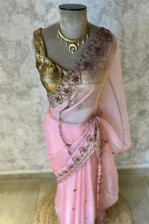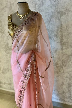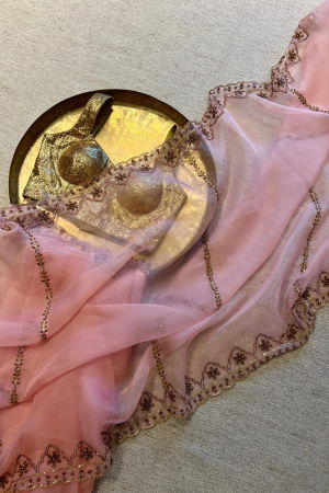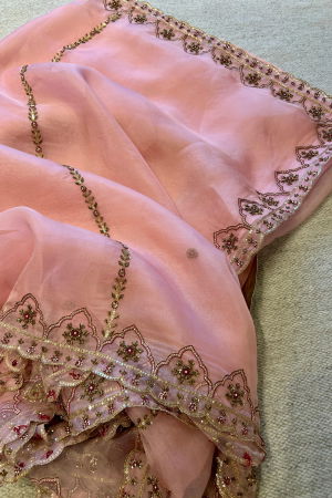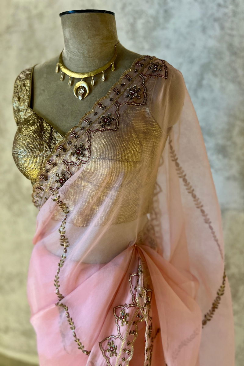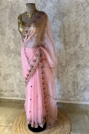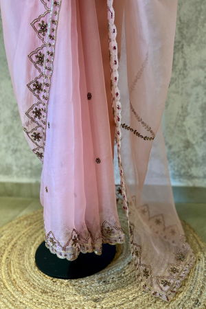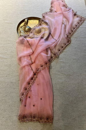 Pink Saree, Silk Organza Saree, Festive Wear Saree, Wedding Saree, Elegant Saree, Traditional Saree, Designer Saree, Embroidered Saree, Party Wear Saree, Ethnic Saree, Luxury Saree, Handcrafted Saree, Zari Work Saree, Sheer Saree, Cultural Attire