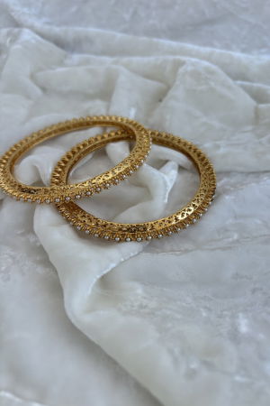 The RAJPUT BANGLES are a refined ensemble of two gold-toned metal bangles, elegantly designed with intricate engraving that enhances their timeless appeal. Each bangle features a delicate white pearl accent, adding a touch of sophistication and grace to the overall design. With a diameter of 7cm, these bangles are thoughtfully crafted to offer a comfortable, free-size fit suitable for a wide range of wrist sizes. Made from durable gold-toned metal, the bangles combine durability with a luxurious finish, making them ideal for extended wear. Perfectly suited for a variety of special occasions, including weddings, engagements, sangeet ceremonies, mehandi functions, receptions, and festive celebrations, these bangles seamlessly complement traditional and contemporary attire. Their versatile design ensures they are a valuable addition to any jewelry collection, particularly as part of a trousseau or bridal ensemble. Available through Peeli Dori Online Store, the RAJPUT BANGLES are a symbol of elegance and cultural heritage, designed to be worn with pride on life's most cherished moments.